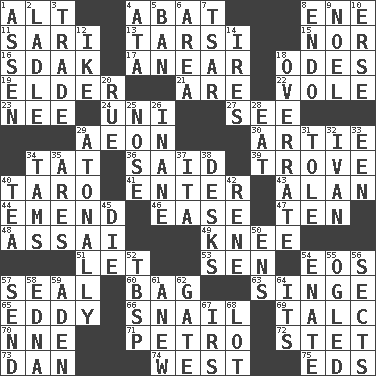 ACROSS 1. The first octave above the treble staff 4. Blind as ____ 8. Compass dir. 11. Indian skirt 13. Tarsus (plural) 15. And not 16. Neighbor of Neb. 17. Approach 18. Lyric poems 19. A person who is older than you are 21. "We ___ not amused" (Victoria) 22. Short-tailed, large-bodied rat 23. Born 24. Corn or form start 27. Perceive with the eye 29. Age 30. Nick name for Arthur 34. Make lace 36. Alleged 39. Collection of objects 40. Pacific island yam 41. Keyboard key 43. ____ Jay Lerner 44. Make improvements or corrections to 46. Relaxation 47. Nine, plus one 48. Slender Brazilian palm 49. Leg joint 51. Allow 53. Elected rep. 54. Greek goddess of the dawn 57. Lick closed 60. Paper or plastic container 63. Scorch 65. Whirlpool 66. Slow-paced one 69. Baby powder 70. Compass dir. 71. Stone: prefix 72. Proofreading order 73. One of the 12 tribes of Israel 74. Compass direction 75. Begley and Asner DOWN 1. NE Netherlands city 2. Dipping utensil 3. Barter 4. _ moment's notice (2 wds.) 5. Prohibit 6. Length times width 7. Russian ruler of old 8. Inside; within (prefix) 9. Christmas carol 10. Celtic language 12. Mamie's mate 14. Angers 18. Make much ado about nothing 20. Regret 25. Olfactory organ 26. Empty; void 28. Ingest 29. Lacking a tonal center or key 31. Lacquered or enameled metalware 32. "Terrible" tsar 33. Car or cant ending 34. Scottish caps 35. Ancient Greek god of war 37. Call ___ day 38. Writing tables 40. Afternoon social gathering 42. French philosopher Descartes 45. Pass on 50. Followers of ems 52. Cook's measure (abbr.) 54. Maternal 55. Stared at amorously 56. Religious groups 57. Transmit 58. Pulitzer Prize-winning author Ferber 59. An important port of Yemen 61. Afresh 62. Yard entry 64. It is 67. Big collection agency 68. Car dealer's back yard