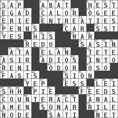 ACROSS 1. Plant excrement 4. Blind as ____ 8. Behest 12. Mild oath 14. Bodily heat indicating an inflammation 16. Double curve, resembling the letter S 17. One of the Great Lakes 18. Pleas 20. Actor Sean's family 22. Automobile 23. Fast jet (abbr.) 24. Affirmative reply 25. Part of HMS, perhaps 28. Impair 30. Redecorate 31. Indian antelope 35. _ moment's notice (2 wds.) 37. Style 40. False hair 41. SW Saudi Arabia district 42. Goodbye (Sp.) 44. To the inside or interior of 45. Painter Guido (1575-1642) 46. Scent 47. Bear (Spanish) 48. Goes without food and/or water 50. The Jewish people; Israel 52. Slangy assent 54. Curvy letter 55. Flowery wreath 58. Quiet! 61. Sliced dessert 63. Eats 65. Neutralize 70. Of or related to the anus 71. So be it 72. Echolocation 73. Cause heat under the collar 74. Connecting point 75. Suttee (variant) 76. Fish or hair follower DOWN 1. Oozy 2. Match 3. Aches 4. Adept person 5. Forbid 6. The first octave above the treble staff 7. Torque (variant) 8. Being at a high temperature 9. The front part of a cuirass 10. Observes 11. Trial 13. Lair 15. 480, 500 or 516 sheets of paper 19. Caspian sea tributary 21. A female animal or person 26. It may be bright or harebrained 27. Twentieth part of a lira 29. Food allowance for one day 30. Noteworthy scarcity 32. Elected reps. 33. "Tell ____ the Marines!" 34. Modern: prefix 35. Toward the sea 36. Metal containers 38. Help 39. Trap for birds or small mammals 41. Sandy's bark 43. Indian titles of respect 49. Back-to-school mo. 51. Order of Saint Francis (abbr.) 53. Sliced desserts 55. Soviet premier 1918-24 56. Peak District village in England 57. Small island 58. Skim 59. Same (prefix) 60. Took on color 62. Greek god of love 64. Ewer handle 66. Compass dir. 67. Santa ___, CA 68. Feline 69. Three (prefix)