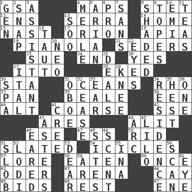 ACROSS 1. Girls' org. (abbr.) 4. Atlas contents 8. Proofreading order 12. Followers of ems 13. Spanish missionary in California 14. Dwelling 15. Political cartoonist Thomas 17. Greek mythologigal hunter 18. Capital of Western Samoa 19. Player piano 21. Spring feasts 23. Institute legal proceedings 24. Conclusion 26. Consenting reply 27. "Tell ____ the Marines!" 28. Supplemented with great effort 30. R.R. building 31. Seas 34. 17th letter of the Greek alphabet 37. Baking dish 38. Calif. Air Force Base 39. Car or cant ending 40. The first octave above the treble staff 41. Rough 42. Compass dir. 43. Ancient Greek god of war 44. Set down 46. Compass dir. 47. Curvy letter 50. To free from 51. Scheduled 54. Winter's stalactites 57. Old wives' tales, e.g. 58. Consumed 60. At one time in the past 62. River in Europe 63. Sports stadium 64. Island 65. Auction offers 66. Relief 67. Compass dir. DOWN 1. Commissioned mil. rank 2. Fastener 3. Aide 4. Haggard of country music 5. Believer in; advocate of (suffix) 6. Adept person 7. Without 8. Cast a shadow over 9. Drinks excessively 10. Independent ruler or chieftain 11. Beverages made from leaves 13. "Barney Miller" actor Jack 16. Drawn tight 20. Modern: prefix 22. Sight organs 25. Allots cards 27. Slanted text style (abbr.) 29. Leg joint 30. Health resort 31. Mitch Miller's instrument 32. Stop 33. Ewer handle 34. Home 35. Behest 36. Single 41. Algonquian 43. Michaelmas daisies 44. Curve 45. _ and Stitch 46. Having ears or earlike features 48. Locates 49. Aroma 51. Messy guy 52. Farming town in central California 53. Letter starter 55. _ tizzy (2 wds.) 56. Glance over 59. "We ___ not amused" (Victoria) 61. Sight organ