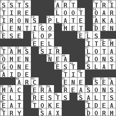 ACROSS 1. Fast planes 5. Tate display 8. Three (prefix) 11. Become fatigued 12. Plunder 14. Boat paddle 15. Removes the wrinkles 17. Food holder 18. Alias (abbr.) 19. Small, flat, pigmented spot on the skin 21. Was introduced to 22. Lair 23. Compass dir. 24. Chop off 25. Raised railways 27. Snakelike fish 28. A whole individual unit 31. Scottish caps 35. Title for a knight 37. Globular water bottle used in Asia 38. Presage 39. Teachers' org. 41. Charged particles 42. Went 43. Eastern Standard Time (abbr.) 45. Narrow board 46. Helper 47. Teat (slang) 49. Curve 51. Compass dir. 52. Ocean 55. Big _ 57. Period 60. Thinks logically 62. Biblical high priest 63. Musical pauses 65. Table seasonings 66. Consume 67. Puff or smoke 68. It may be bright or harebrained 69. Attempt to accomplish something 70. Saxophone 71. Dormintory (informal) DOWN 1. Vertical member of a panel or frame 2. Begets 3. Heavy duty weighing machine 4. Transmitted 5. Everything 6. Wander aimlessly 7. Lug 8. Inedible or poisonous agaric 9. Immoral or dissolute person 10. SW Asia republic 13. Wig 16. Drop; flow; fall 17. Cotton for raincoats, e.g. 20. Leaves 26. Ms. Damita and namesakes 29. Inactive volcano in Sicily 30. Vertical spar for supporting sails 31. Ancient Roman robe 32. Mine, in Marseilles 33. Ananias' fault 34. Contemptuous expression 36. To riddle 40. Michaelmas daisies 44. Prong on a fork 48. Beverages made from leaves 50. Sure thing 52. Twentieth part of a lira 53. Keyboard key 54. Indian state 55. Rendezvous 56. Having or resembling wings 58. Vintage cars 59. "____ silly question..." 61. Stated 64. John Ritter's dad