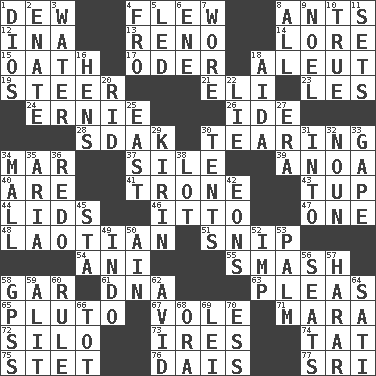 ACROSS 1. Morning condensation 4. Soared 8. Pismires 12. _ tizzy (2 wds.) 13. Western Nevada city 14. Old wives' tales, e.g. 15. Pledge 17. River in Europe 18. Eskimo relative 19. Navigate 21. Connecticut Ivy Leaguer 23. French article 24. Bert's buddy 26. Binary compound 28. Neighbor of Neb. 30. Pulling into pieces 34. Spoil 37. Drop; flow; fall 39. Small Philippine buffalo 40. "We ___ not amused" (Victoria) 41. Heavy duty weighing machine 43. Uncastrated adult male sheep 44. Flaplike coverings 46. "Tell ____ the Marines!" 47. Single 48. Of or relating to Laos or its people 51. Sever or remove by pinching or nipping 54. Black tropical American cuckoo 55. Box-office sellout 58. Slender fish 61. Heredity factor (abbr.) 63. Entreaties 65. Greek god of the underworld 67. Short-tailed, large-bodied rat 71. Hindu Mythology: god of death 72. Grain storage tower 73. Angers 74. Make lace 75. Proofreading order 76. Raised platform 77. Indian title of respect (Mr.) DOWN 1. "Vaya con ____" 2. Maternal 3. Wetness 4. Away 5. Directed 6. Compass dir. 7. Had on 8. 100% 9. Christmas carol 10. Loyal 11. Arranges properly for use 16. Coop moms 18. Opera by Verdi 20. To free from 22. Whopper 25. 90 degrees 27. Period 29. Japanese brewing company 30. Portable shelters 31. To the inside or interior of 32. Part of speech 33. Yawn 34. Shopping center 35. Operatic vocal solo 36. Make new 38. Car dealer's back yard 42. Immeasurably long periods of time 45. R.R. building 49. Southeast Asian peninsula 50. The 18th letter of the Arabic alphabet 52. Mischievous child 53. Inside of hand 56. Theater features 57. Ethiopian city, capital of Harari 58. Global Positioning Systems (abbr.) 59. Set down 60. Court order 62. Enthusiastic 64. Suttee (variant) 66. Small child 68. Mouth or opening 69. Luau accessory 70. Double-curved letter