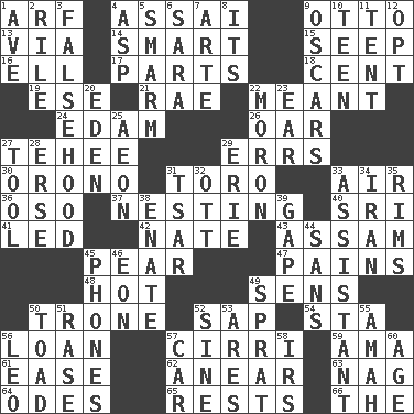 ACROSS 1. Sandy's bark 4. Slender Brazilian palm 9. Von Bismarck 13. By way of 14. Don Adams' spy role 15. Ooze 16. Pipe bend 17. Components 18. Penny 19. Compass dir. 21. Actress Charlotte 22. Intended 24. Dutch treat 26. Boat paddle 27. Giggle 29. Blunders 30. U. of Maine site 31. "Corrida" creature 33. Atmosphere 36. Bear (Spanish) 37. Snuggling 40. Indian title of respect (Mr.) 41. Directed 42. Nathan's nickname 43. Indian state 45. Lightbulb-shaped fruit 47. Aches 48. Being at a high temperature 49. Elected reps. 50. Marketplace scale 52. Plant excrement 54. R.R. building 56. Grant temporary use of 57. High-altitude cloud 59. Wet nurse (var.) 61. Comfort 62. Approach 63. Tired old horse 64. Lyric poems 65. Musical pauses 66. Definite Article DOWN 1. "___ Maria" 2. Cause heat under the collar 3. It jiggles the polygraph 4. Viper 5. Excessive but superficial compliments 6. "Two Mules for Sister ____" 7. Johnson of "Laugh-In" 8. ___ a Wonderful Life 9. Motion picture awards 10. Adolescent 11. Portable shelter 12. Elect 20. Locale of original sin 22. Person of subnormal intelligence 23. Ewer handle 25. Age 27. Utensil 28. Celtic language 29. One of the Great Lakes 31. Russian ruler of old 32. Baseball player Mel 33. Aide 34. SW Asia republic 35. Basketball hoops 38. Related on the mother's side 39. Open wide 44. Without 45. Gives a jingle 46. Age 49. Small fatty European fish 50. Frog relative 51. To erase 52. Trig term 53. Ancient Greek god of war 55. Housemaid 56. Lion 57. Auto 58. Big collection agency 60. Mature