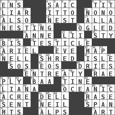 ACROSS 1. Followers of ems 4. Ketch in the Levant 8. Teat (slang) 11. One who doesn't tell the truth 13. "Tell ____ the Marines!" 14. Words to Nanette 15. In addition 16. A home for chicks 17. Silent film actress Nazimova 18. Inhabiting a nest 21. Stared 22. Singer Murray 23. Cards in a Roman deck? 25. Filthy place 26. Altar cloth linen 29. A testis 32. Satellite of Uranus 34. First lady 35. Atlas unit 38. 1994 drama film starring Jodie Foster 39. Fragment 41. Small island 43. Mayday 44. Greek goddess of the dawn 45. Frees from moisture 46. Plea 50. Actress Charlotte 51. Strand of rope, yarn or thread 54. Sound made by sheep 55. Prong on a fork 57. Climbing, woody, usually tropical vines 59. Pertaining to the sea 63. 43,560 square feet 64. Small valley 67. To erase 68. Emitted 69. Famous astronaut Armstrong 70. Connect, as a bridge 71. Mountains (abbr.) 72. High mountains 73. Nonscientific branch of learning DOWN 1. Liveliness 2. The longest river in the world 3. Backtalk 4. Burns superficially 5. Had dinner 6. It is 7. Small bed 8. For Whom the Bell _____ 9. An arm off of a larger body of water 10. Sycophant 12. Round or rotation of duties 14. Tired old horse 19. International (abbr.) 20. Compass dir. 21. Petroleum 23. Moving, as bait 24. On the rocks 26. Bar 27. Angers 28. Grain storage tower 30. Laconic 31. Arab leader 33. Otherwise 36. SW Saudi Arabia district 37. Entreaty 39. Bristle 40. Israeli folk dance 42. Compass dir. 45. Unit of force 47. Basketball assoc. 48. Ringlike coral islands and reefs 49. Nervous spasm 51. Suffix with ecto or cyto 52. It is permitted: Lat. 53. Tall tales 56. Hearing organs 58. Fish or hair follower 60. California wine valley 61. Austrian river, tributary to the Danube 62. Penny 64. Heredity factor (abbr.) 65. Snakelike fish 66. Mouth edge