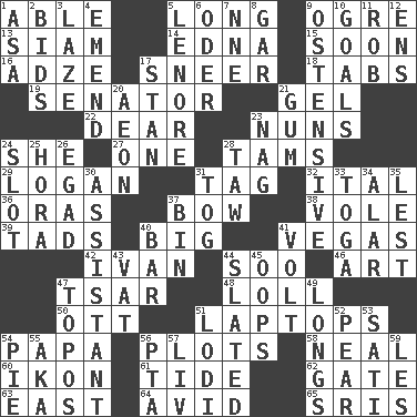 ACROSS 1. Competent 5. Yearn 9. Legendary monster 13. Thailand, formerly 14. Pulitzer Prize-winning author Ferber 15. Within a short period 16. Edge tool used to cut and shape wood 17. Contemptuous expression 18. Bar bills 19. Elected representative 21. Set 22. Letter starter 23. Religious women 24. A female animal or person 27. Single 28. Scottish caps 29. Utah city north of Ogden 31. Label 32. Slanted text style (abbr.) 36. Mouths or openings 37. Ribbon knot 38. Short-tailed, large-bodied rat 39. Small boys 40. Massive 41. Viva Las _ 42. "Terrible" tsar 44. "Barney Miller" actor Jack 46. Nonscientific branch of learning 47. Russian ruler of old 48. Hang loosely or laxly 50. Baseball player Mel 51. Portable computers 54. Dad 56. Ground plans 58. Actress Patricia 60. Visual representation of an object 61. Event that recurs at intervals 62. Yard entry 63. Compass direction 64. Enthusiastic 65. Indian titles of respect DOWN 1. White ___ sheet 2. Auction offers 3. Goldbrick 4. Make improvements or corrections to 5. Poe poem 6. Baltic tributary 7. Compass dir. 8. Slender fish 9. Clearly or manifestly demonstrative 10. Scores awarded for successful feats 11. Director Reiner 12. Followers of ems 17. Comedian Laurel of Laurel & Hardy 20. Age 21. Chewing product 23. Tired old horse 24. Narrow, elongated depression 25. Israeli folk dance 26. Mild oath 28. The 23rd letter of the Hebrew alphabet 30. Helper 31. Coat; cloak 33. Ancient Roman robe 34. Having or resembling wings 35. For fear that 37. Storage container 40. Long, evenly shaped piece 41. Electrical Unit 43. Large container 44. Scheduled 45. I made a mistake 47. Literary convention 49. Yearns 51. Farming town in central California 52. Lightbulb-shaped fruit 53. Suttee (variant) 54. Sliced dessert 55. Alias (abbr.) 56. Parent Teacher Association (abbr.) 57. 54 in ancient Rome 59. French article