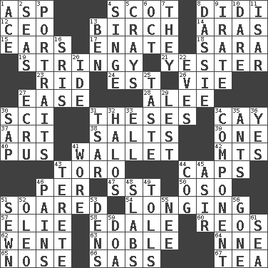ACROSS 1. Viper 4. Native of Scotland 8. "You Light Up My Life" star Conn 12. Corporate head (abbr.) 13. A tree used for making furniture 14. Caspian sea tributary 15. Hearing organs 17. Related on the mother's side 18. "Two Mules for Sister ____" 19. Slender, wiry 21. Next before 23. To free from 24. Eastern Standard Time (abbr.) 26. Compete 27. Relaxation 28. Toward shelter 30. _-fi 31. College papers 34. Island 37. Nonscientific branch of learning 38. Table seasonings 39. Single 40. Fluid product of inflammation 41. Place for singles 42. Mountains (abbr.) 43. "Corrida" creature 44. Balmoral and tarboosh 46. For each 47. Fast jet (abbr.) 50. Bear (Spanish) 51. Flew 54. Yearning 57. Writer Wiesel 58. Peak District village in England 60. Vintage cars 62. Gone 63. Having high moral qualities 64. Compass dir. 65. Olfactory organ 66. Backtalk 67. Beverage made from leaves DOWN 1. Adept person 2. Oceans 3. Likenesses of persons 4. Burn superficially 5. Trading vessels 6. Sep. follower 7. Those things 8. Small ungulate mammals of Africa 9. Feeling or showing extreme anger 10. Have the gumption 11. Austrian river, tributary to the Danube 13. Benjamin's nick name 16. Indian titles of respect 20. Binary compound 22. Nights before holidays 25. Clothes sense 27. Shade of tan 29. For fear that 30. Plant excrement 31. Russian ruler of old 32. Radiant circles of light 33. Pipe bend 34. Piece 35. Pismires 36. Affirmative reply 41. Had on 43. Cylindrical with tapered ends 44. Gear tooth 45. SW Saudi Arabia district 46. Aches 48. Broad, flat, thick pieces 49. For Whom the Bell _____ 51. Stitched 52. Butter sub 53. Cub Scout units 55. Born 56. Went 59. ___ good deed 61. Ocean