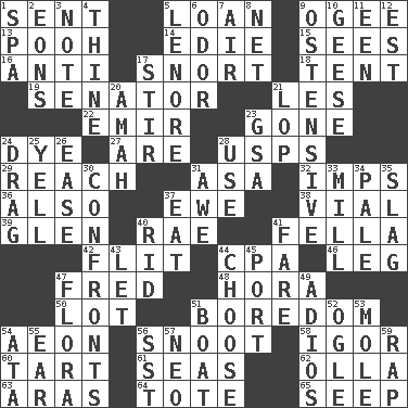 ACROSS 1. Transmitted 5. Grant temporary use of 9. Double curve, resembling the letter S 13. "Silly old bear" 14. Singer Brickell 15. Perceives with the eye 16. Against 17. Derisive sound 18. Portable shelter 19. Legislator 21. French article 22. Independent ruler or chieftain 23. Went 24. Color 27. "We ___ not amused" (Victoria) 28. United States Postal Service (abbr.) 29. Arrive at 31. White ___ sheet 32. Naughty children 36. In addition 37. She-sheep 38. Small bottle 39. Small, secluded valley 40. Actress Charlotte 41. Man or boy (slang) 42. Sudden quick movement 44. Numbers guy (abbr.) 46. Part of a journey 47. Flintstone 48. Israeli folk dance 50. Car dealer's back yard 51. Mood resulting from idleness 54. Period of immesurable duration 56. Snout, nose 58. Composer Stravinsky 60. Small pie 61. Oceans 62. Rounded earthenware pot or jar 63. Ancient river in northeast Turkey 64. Haul 65. Ooze DOWN 1. Health resort 2. Immeasurably long periods of time 3. Musical sound 4. One or ones belonging to thee 5. Poe poem 6. Aroma 7. Wind 8. Fish or hair follower 9. Clearly or manifestly demonstrative 10. Honkers 11. Car or cant ending 12. Eastern Standard Time (abbr.) 17. Tumult 20. Nursemaid 21. Chop off 23. Girls' org. (abbr.) 24. To trail on the ground 25. Shout 26. Relaxation 28. Purpose 30. Meets 31. Deep reverence 33. Place where flour is made 34. Diluted with white 35. Volcanic refuse 37. Ingest 40. To free from 41. Conductor's collection 43. Allow 44. Opt 45. Left side of a ship or aircraft 47. Plants 49. Goodbye (Sp.) 51. Water vessel 52. Stare at amorously 53. Undercover agent 54. _ moment's notice (2 wds.) 55. Hearing organ 56. Fast jet (abbr.) 57. Modern: prefix 59. Strike