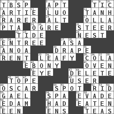 ACROSS 1. Cook's measure (abbr.) 5. Fitting 8. Nervous spasm 11. Nick name for Arthur 13. Nilotic language 14. Hyperbolic tangent 15. Less widely known 16. Keyboard modifier key 17. Spanish pot 18. Parent Teacher Assoc. 19. Legendary monster 21. Guide 22. Periodic rise and fall of the sea level 24. Egg locale 25. Main course 27. White ___ sheet 29. Small Philippine buffalo 30. Window treatment 32. Monthly bill 33. Like summer trees 35. Root beer relative 39. Dark wood 41. Baking chamber 42. Sight organ 43. Keyboard key 45. Drink excessively 48. One who uses or employs something 49. Motion picture award 50. Specific locale 52. To free from 55. Highlander 56. Health resort 57. Elude 59. Dutch treat 60. Possessed 61. Eroded 62. Car or cant ending 63. Followers of ems 64. Beverages made from leaves DOWN 1. Canvas cover 2. Naughty child 3. Ski resort town in Vermont 4. Sliced dessert 5. Having or resembling wings 6. Whimper 7. Small child 8. Stories 9. An arm off of a larger body of water 10. Burn to charcoal 12. Eat (away) 14. Lug 20. Turn to the right 21. Fastener 23. Feeling or showing extreme anger 25. Hearing organ 26. Compass dir. 27. Sandy's bark 28. Declare 30. 24 hours 31. Learning spot: Fr. 33. Myrna of the movies 34. Compass dir. 36. Make much ado about nothing 37. Allow 38. A saturated hydrocarbon 40. Fermented drink made from hops 43. Superhero pair 44. First name in cosmetics 45. Sadhe (variant) 46. Sea 47. Inside of hand 49. Double curve, resembling the letter S 50. Connect, as a bridge 51. Groovy apts. 53. It may be bright or harebrained 54. Cub Scout units 56. A female animal or person 58. Large container