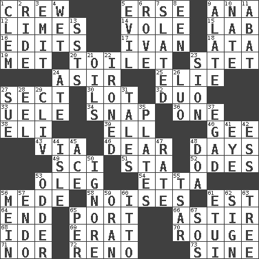 ACROSS 1. Ship's personnel 5. Celtic language 9. Santa ___, CA 12. Citrus fruits 14. Grand slam 15. Experiment locale 16. Proofreads 17. "Terrible" tsar 18. "One Day ___ Time" 19. Was introduced to 20. Bathroom 23. Proofreading order 24. SW Saudi Arabia district 25. Writer Wiesel 27. Religious group 30. Car dealer's back yard 32. Superhero pair 33. Ubangi River tributary 34. Fastener 36. Single 38. Connecticut Ivy Leaguer 39. Pipe bend 40. Turn to the right 43. By way of 46. Letter starter 48. 24-hour periods 49. _-fi 51. R.R. building 52. Lyric poems 53. Cassini of fashion 54. Singer James 56. Ancient Persian 58. Annoying sounds 61. Eastern Standard Time (abbr.) 64. Conclusion 65. Sweet dark-red dessert wine 66. Being in motion 68. Binary compound 69. Part of Q.E.F. 70. Makeup applied to the cheeks 71. Not either 72. Western Nevada city 73. Trig term DOWN 1. Clement's nick name 2. Travel on an animal 3. Send forth 4. Soggy 5. Morally bad or wrong 6. Be footloose 7. Scheduled 8. Car or cant ending 9. Having winglike extensions 10. Nathan's nickname 11. Blind as ____ 13. Fast planes 21. Petroleums 22. Pressed 23. The Jewish people; Israel 24. Had dinner 26. Nilotic language 27. Take to court 28. Snakelike fish 29. 154 in Roman numerals 31. Falsehoods 35. Food holders 37. Mild oath 41. Sight organ 42. Curvy letter 44. Capri or Wright 45. Adept person 47. Pace 48. ___ good deed 50. Refuse to acknowledge 53. More peculiar 55. Russian ruler of old 56. Count _ (2 wds.) 57. Inside; within (prefix) 59. NW Algerian seaport 60. "Tell ____ the Marines!" 61. Needle holder 62. Attach a signature 63. Family _ (genealogy) 65. For each 67. Distress signal