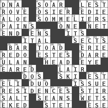 ACROSS 1. Heredity factor (abbr.) 4. Fly high 8. For fear that 12. Be footloose 14. Flexible twig of a willow tree 16. Singer Brickell 17. _ vera 18. Wine waiters 20. Aches 22. Single 23. Fish or hair follower 24. Conclusion 25. Followers of ems 28. It is 30. Slanted text style (abbr.) 31. Religious groups 35. Drinking establishment 37. Frog relative 40. One of the Great Lakes 41. Make new 42. _____ Park, CO 44. Have the gumption 45. ____ Bator, Mongolia 46. Froth on beer 47. Sight organ 48. Having ears or earlike features 50. Den 52. Two (Sp.) 54. What Jean-Claude Killy likes to do 55. Eastern Standard Time (abbr.) 58. Connecticut Ivy Leaguer 61. Superhero pair 63. Come out of 65. Dwellings 70. Disorderly outburst 71. Table seasoning 72. Actors Connery and Penn 73. Moistens 74. Made supply last 75. Proofreading order 76. Compass dir. DOWN 1. Window treatment 2. Pitcher Ryan 3. Keep away from 4. Mayday 5. Bear (Spanish) 6. Direct toward a target or goal 7. San ____ (Riviera town) 8. Luau accessory 9. Genesis locale 10. Title for a man of rank and authority 11. Trial 13. Car or cant ending 15. Painter Guido (1575-1642) 19. Allows 21. Put into a specified state 26. Nathan's nickname 27. Splash clumsily 29. Sowing specialist 30. Pressed 32. Supercomputer manufacturer 33. Become fatigued 34. Observe 35. Actor Lugosi 36. The sixth month of the Jewish calendar 38. Had dinner 39. Allots cards 41. Sorrow 43. Neighbor of Neb. 49. Texas town _ City 51. One more than two 53. Takes to court 55. First name in cosmetics 56. Sets or collections 57. Laconic 58. Celtic language 59. Path through which fluid escapes 60. Capri or Wright 62. Singles 64. Compass dir. 66. It would 67. Feline 68. Compass dir. 69. Fast jet (abbr.)