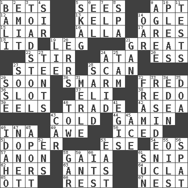 ACROSS 1. Antes 5. Perceives with the eye 9. Fitting 12. Mine, in Marseilles 13. Seaweed 14. Stare 15. One who doesn't tell the truth 16. Silent film actress Nazimova 17. Ancient Greek god of war 18. It would 19. Part of a journey 21. Relatively large 22. Use a spoon 24. _ moment's notice (2 wds.) 26. Double-curved letter 27. Bull 28. Glance over 29. Within a short period 30. Excessive but superficial compliments 32. Flintstone 36. Groove 37. Connecticut Ivy Leaguer 38. Do over again 39. Snakelike fish 40. Exchange 42. At sea 43. Lacking warmth 44. Homeless child 46. _ tizzy (2 wds.) 49. Deep reverence 50. On the rocks 51. Drug addict 53. Compass dir. 54. Greek goddess of the dawn 57. Soon (poet.) 58. Greek goddess of the earth (variant) 61. Sever or remove by pinching or nipping 62. Possessive pronoun 63. Pismires 64. Southern CA. univ. 65. Baseball player Mel 66. State of inaction 67. A home for chicks DOWN 1. Indonesian resort city 2. Give off 3. Inedible or poisonous agaric 4. Title for a knight 5. Heroin 6. Snakelike fish 7. Pipe bend 8. Health resort 9. Match 10. Entreaties 11. Trials 14. Boat paddle 19. Untruth 20. Blunders 21. Separate the seeds from cotton 23. Portable shelters 24. Sour-tasting 25. Scottish cap 27. Not divided or shared with others 28. First course 29. Compass dir. 31. Haggard of country music 32. Movie unit 33. Dwelling 34. Paradise 35. ___ good deed 40. Pull behind 41. The front part of a cuirass 43. Auto 45. Adept person 46. Potato state 47. Music written for nine 48. To the left, to Queeg 52. Followers of ems 53. 90 degrees 55. Petroleums 56. Argument over a trivial matter 58. Slender fish 59. A saturated hydrocarbon 60. ___ a Wonderful Life 61. Player for Phoenix