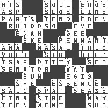 ACROSS 1. Mountains (abbr.) 4. The visible part of the earth's surface 8. Greek god of love 12. Viper 13. A type of plum 14. Actor's bit 15. Pieces 18. Be inclined (to) 19. Locale of original sin 20. Noisy, rowdy, vocal (Spanish) 22. First lady 23. Dutch treat 24. Unit of force equal to gravity 25. Make supply last 26. Pre-World Series prize 30. Santa ___, CA 33. Relating to the nose 36. Musical group of three 37. Electrical Unit 39. Title for a knight 40. Assist 41. Austrian river, tributary to the Danube 42. Simple song 44. Perceive with the eye 45. Legislator 47. Large container 50. Player for Phoenix 51. The front part of a cuirass 53. A female animal or person 54. Gist 57. Ketch in the Levant 59. Argument over a trivial matter 61. Gospel singer Marvin 63. Inactive volcano in Sicily 64. Beget 65. Can I? 66. Adolescent 67. Gone 68. Take to court DOWN 1. Atlas unit 2. Russian ruler of old 3. Disorder 4. Fast planes 5. Margarine 6. Electrically charged atom 7. Directed 8. Veterans Day date 9. Travel on or in a vehicle 10. Single 11. Elected rep. 16. Periodic rise and fall of the sea level 17. Neighbor of Neb. 21. Sign of things to come 22. Car or cant ending 24. Set 26. Component 27. Ancient Greek god of war 28. Mediterranean tributary 29. Drink excessively 30. Advice 31. Characteristic smell of wine 32. Actor Alda or Thicke 34. SW Saudi Arabia district 35. Be seated 38. File 13 42. Spanish title 43. Jacques Cousteau's middle name 46. Third day of the wk. 48. Eras 49. Prong on a fork 52. Fraudulent business schemes 53. Trig term 54. Merit 55. Proofreading order 56. Son of Isaac 57. Put into a specified state 58. Had dinner 59. Compass dir. 60. Sliced dessert 62. Sight organ