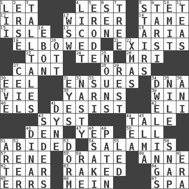 ACROSS 1. Allow 4. For fear that 8. Proofreading order 12. Lyricist Gershwin 13. One who wires 14. Not wild 15. Capri or Wright 17. Biscuitlike quick bread 18. Roberta Peters solo 19. Turned at an angle; bent 21. Is extant 23. Small child 24. "___ Little Indians" 26. Medical imaging device (abbr.) 27. Patter 28. Mouths or openings 30. Snakelike fish 31. Takes place subsequently 34. Heredity factor (abbr.) 37. Compete 38. Tall tales 39. Victory 40. Raised railways 41. Cease 42. Connecticut Ivy Leaguer 43. System (abbr.) 44. Story 46. Lair 47. Slangy assent 50. Pipe bend 51. Tolerated 54. Deli grouping 57. French philosopher Descartes 58. Speak pompously 60. Queen of England 1702-14 62. Pull into pieces 63. Moved through 64. Slender fish 65. Blunders 66. Count _ (2 wds.) 67. Health resort DOWN 1. Cards in a Roman deck? 2. Celtic language 3. Baron Munchausen's specialties 4. It is permitted: Lat. 5. Eat (away) 6. Elected rep. 7. Woody plant 8. Flight of steps 9. Tarsus (plural) 10. Give off 11. Beverages made from leaves 13. Compass dir. 16. Inky black, to poets 20. Baseball player Mel 22. Dec. holiday 25. Parts of speech 27. To provide with a ceiling 29. Respite 30. Night before a holiday 31. Snake ____ (dice throw) 32. Thoroughly unpleasant 33. _ Lanka 34. Homes 35. "Death on the ____" 36. Cuckoo 41. Unit of force 43. Spring feasts 44. Afternoon social gathering 45. _ mater 46. Middle Eastern gold or silver currency 48. 1973 Nobel Price Winner (Physics) Leo 49. Eucharist need 51. Johnson of "Laugh-In" 52. Fermented drink made from hops 53. Dormintory (informal) 55. Directed 56. Fastener 59. Actress Charlotte 61. Epoch
