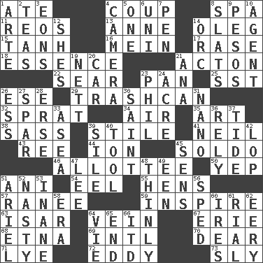 ACROSS 1. Had dinner 4. Clever action or accomplishment 8. Health resort 11. Vintage cars 13. Singer Murray 14. Cassini of fashion 15. Hyperbolic tangent 16. Count _ (2 wds.) 17. Raze (variant) 18. Core 21. NE Massachussets city 22. Singe 23. Baking dish 25. Fast jet (abbr.) 26. Compass dir. 29. File 13 32. Small fatty European fish 34. Atmosphere 35. Tate display 38. Backtalk 39. Vertical member of a panel or frame 41. Famous astronaut Armstrong 43. To riddle 44. Electrically charged atom 45. Twentieth part of a lira 46. One to whom something is allotted 50. Slangy assent 51. Black tropical American cuckoo 54. Snakelike fish 55. Coop moms 57. Indian princess (variant) 59. Motivate 63. Austrian river, tributary to the Danube 64. Distinctive style or manner 67. 4th largest of the Great Lakes 68. Inactive volcano in Sicily 69. International (abbr.) 70. Letter starter 71. Potassium hydroxide 72. Whirlpool 73. Mischievous DOWN 1. Johnson of "Laugh-In" 2. Afternoon social gatherings 3. Immeasurably long periods of time 4. Device for capturing images 5. Single 6. Corn or form start 7. Animal enclosure 8. Narrow boards 9. Mexican monetary units 10. Rep 12. "______ My Girl" (Turtles hit) 14. The grampus (Milton) 19. Remaining after all deductions 20. Automobile 21. Santa ___, CA 23. Silvers or Donahue 24. Land measure 26. Curvy letter 27. Practice fight 28. Celtic language 30. Inhabitant of Heaven 31. Billionth: prefix 33. Toward the sea 36. Have trust in 37. Periodic rise and fall of the sea level 39. Filth; sediment 40. Instrument 42. Trim (branches) 45. Elected reps. 47. Area sheltered from the wind 48. Without thickness 49. Car or cant ending 51. Satellite of Uranus 52. Smutty 53. Empty; void 56. Hurried 58. Period 60. Angers 61. Monetary unit of Yemen 62. Suggestive of the supernatural 64. Compete 65. Conclusion 66. It would
