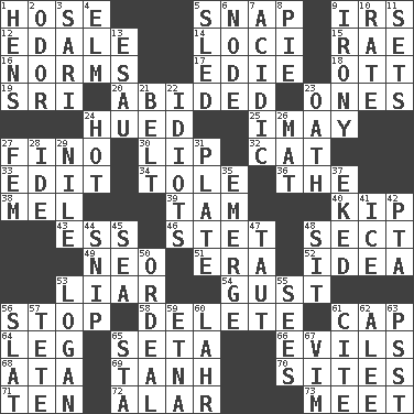 ACROSS 1. Stockings 5. Fastener 9. Big collection agency 12. Peak District village in England 14. Venues 15. Actress Charlotte 16. Typical standards 17. Singer Brickell 18. Baseball player Mel 19. _ Lanka 20. Stayed 23. Washington bills 24. Took on color 25. "If ____ say so..." 27. A pale, very dry sherry 30. Mouth edge 32. Feline 33. Prepare for publication 34. Lacquered or enameled metalware 36. Definite Article 38. Cartoonist voice _ Blanc 39. Scottish cap 40. Monetary unit of Laos 43. Double-curved letter 46. Proofreading order 48. Religious group 49. Modern: prefix 51. Period 52. The main thing one is thinking about 53. One who doesn't tell the truth 54. Abrupt rush of wind 56. Constrict 58. Keyboard key 61. Head covering 64. Part of a journey 65. Stalk of a moss capsule 66. Vices 68. "One Day ___ Time" 69. Hyperbolic tangent 70. Settings 71. "___ Little Indians" 72. Having or resembling wings 73. Confront DOWN 1. Coop moms 2. Aroma 3. Indian skirt 4. Shade tree 5. Downhill vehicle 6. Connecting point 7. Being or containing an acid 8. Sliced dessert 9. Literary sarcasm 10. Assign a rank or rating to 11. Arranges properly for use 13. Son of Isaac 21. Waist strap 22. Foolish or stupid persons 23. Pledge 24. Being at a high temperature 26. Floor covering 27. Opposite of masc. 28. Binary compound 29. Mediterranean tributary 31. Food holder 35. Develop 37. Made supply last 41. Frozen water 42. Parent Teacher Assoc. 44. Sever or remove by pinching or nipping 45. Ocean 47. Strained 48. Be seated 50. Severe or trying experience 53. Utah city north of Ogden 55. Perceives with the eye 56. Narrow board 57. Wig 59. Inactive volcano in Sicily 60. Cowardly lion portrayer 61. Quote 62. Toward shelter 63. Inconspicuous attention getter 65. R.R. building 67. Zeal