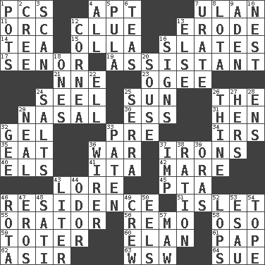 ACROSS 1. Personal Computers (abbr.) 4. Fitting 7. Uhlan (variant) 11. The grampus (Milton) 12. A slight indication 13. Eat (away) 14. Beverage made from leaves 15. Water jar 16. Chalkboards 17. Sir (Sp.) 19. Helper 21. Compass dir. 23. Double curve, resembling the letter S 24. Stitch closed the eyes of (a falcon) 25. Player for Phoenix 26. Definite Article 29. Rhinal 30. Double-curved letter 31. Layer 32. Set 33. Before (prefix) 34. Big collection agency 35. Consume 36. Armed conflict 37. Removes the wrinkles 40. Raised railways 41. Call ___ day 42. Female horse 43. Old wives' tales, e.g. 45. Parent Teacher Association (abbr.) 46. Dwelling 51. Small island 55. Speaker 56. San ____ (Riviera town) 58. Bear (Spanish) 59. Carrier 60. Style 61. Infant food 62. SW Saudi Arabia district 63. Compass dir. 64. Take to court DOWN 1. Plant holders 2. Algonquian 3. Skim 4. 100% 5. Monetary unit of Botswana 6. Afternoon social gatherings 7. A salt of uric acid 8. Globular water bottle used in Asia 9. An important port of Yemen 10. A home for chicks 12. Pupil covering 13. Otherwise 16. Signals 18. Washington bills 20. Lush 22. Pipe bend 24. Table seasonings 25. Spanish missionary in California 26. One or ones belonging to thee 27. Possessive pronoun 28. Followers of ems 29. Be tempered by heat 32. Unit of force equal to gravity 33. Eucharist need 36. One who wires 37. Mischievous child 38. Food allowance for one day 39. Mouths or openings 43. 61 cubic inches 44. Aroma 46. Round or rotation of duties 47. Greek god of love 48. Suttee (variant) 49. Group working together 50. Snakelike fish 52. Chops off 53. He sold his birthright 54. Drink excessively 57. Informal term for the mouth