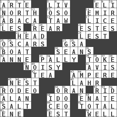 ACROSS 1. Johnson of "Laugh-In" 5. 54 in ancient Rome 8. Connecticut Ivy Leaguer 11. _ pole 13. Bear (Spanish) 14. Independent ruler or chieftain 15. Phillipine bananalike plant 16. The 23rd letter of the Hebrew alphabet 17. Louse (plural) 18. French article 19. Rump 21. _____ Park, CO 22. Froth on beer 24. For fear that 25. Motion picture awards 27. Girls' org. (abbr.) 29. Water vessel 30. Actors Connery and Penn 32. Queen of England 1702-14 33. Friendly 35. Casino tip 39. Annoyingly loud 41. Deliberation 42. Beverage made from leaves 43. Electrical Unit 45. Egg locale 48. Cowardly lion portrayer 49. Cowboy competition 50. Northwest Algerian city 52. To free from 55. ____ Jay Lerner 56. Wedding promise 57. Related on the mother's side 59. Table seasoning 60. Corporate head (abbr.) 61. "_____ Recall" 62. Compass dir. 63. Eastern Standard Time (abbr.) 64. Not ill DOWN 1. Of or related to the anus 2. Loose flowing garment 3. File 13 4. And so on (abbr.) 5. Globular water bottle used in Asia 6. Austrian river, tributary to the Danube 7. Solemn pledge 8. Sends forth 9. It is permitted: Lat. 10. Angers 12. Ethiopian city, capital of Harari 14. Otherwise 20. Begley and Asner 21. Flair 23. Ingested 25. Chief or king in Benin or Nigeria 26. Manchild 27. Set 28. Declare 30. Mischievous 31. Staphylococcus 33. Sliced dessert 34. White ___ sheet 36. Make much ado about nothing 37. Apertif with cassis 38. Compass dir. 40. Von Bismarck 43. In the manner of 44. French painter Edouard 45. Pitcher Ryan 46. Peak District village in England 47. Posted 49. To erase 50. Lyric poems 51. Carrot, for example 53. Slanted text style (abbr.) 54. Small valley 56. Frozen water 58. At this time