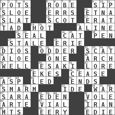 ACROSS 1. Plant holders 5. Loose flowing garment 9. Small drink 12. _ gin 13. Blunders 14. Inactive volcano in Sicily 15. Narrow board 16. Highlander 17. Part of Q.E.F. 18. Small boy 19. Being at a high temperature 21. Place in a line 22. Lick closed 24. Feline 26. Animal enclosure 27. Having lost freshness 28. One of the Great Lakes 29. "Vaya con ____" 30. More peculiar 32. Jazz singing style 36. _ vera 37. Single 38. Bowlike part 39. Not ill 40. 1973 Nobel Price Winner (Physics) Leo 42. Old wives' tales, e.g. 43. Makes supply last 44. Desist 46. Cleo's killer 49. Directed 50. Conclusions 51. Excessive but superficial compliments 53. Binary compound 54. Armed conflict 57. "Two Mules for Sister ____" 58. Locale of original sin 61. Grand slam 62. Johnson of "Laugh-In" 63. Small bottle 64. SW Asia republic 65. Mountains (abbr.) 66. Suggestive of the supernatural 67. Singer Brickell DOWN 1. Inconspicuous attention getter 2. Water jar 3. Inedible or poisonous agaric 4. Put into a specified state 5. State of inaction 6. The grampus (Milton) 7. Sis' sibling 8. Eastern Standard Time (abbr.) 9. Empty completely 10. Empty; void 11. Eucharist need 14. Snakelike fish 19. Actor Linden 20. Margarine 21. Had dinner 23. Artist's stand 24. Small stream 25. Wind 27. Drop; flow; fall 28. Ferber et al. 29. Fool 31. Administered medicine 32. First course 33. What you're doing now 34. 43,560 square feet 35. Definite Article 40. Supplement with great effort 41. On the rocks 43. Shade tree 45. Compass dir. 46. Indian state 47. Don Adams' spy role 48. Components 52. Actress Charlotte 53. Inwardly 55. Jai _ 56. French philosopher Descartes 58. Night before a holiday 59. Expire 60. Ewer handle 61. Compete