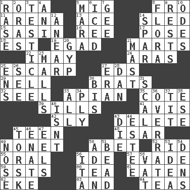 ACROSS 1. Round or rotation of duties 5. Russian fighter aircraft 8. Away 11. Sports stadium 13. Adept person 14. Downhill vehicle 15. Indian antelope 16. To riddle 17. Introduce or present, as a question 18. Eastern Standard Time (abbr.) 19. Mild oath 21. Shops 22. "If ____ say so..." 24. Ancient river in northeast Turkey 25. Fortification 27. Begley and Asner 29. 1994 drama film starring Jodie Foster 30. Naughty children 32. Sew up the eyelids of hawks and falcons 33. Bee-related 35. ____ d'Azur (French Riviera) 39. Beverly of Met fame 41. Deliberation 42. Insidious 43. Erase 45. Adolescent 48. Austrian river, tributary to the Danube 49. Music written for nine 50. Collude with 52. To free from 55. Relating to the mouth 56. Binary compound 57. Dodge 59. Fast planes 60. Beverage made from leaves 61. Eroded 62. Supplement with great effort 63. Added to 64. Afternoon social gatherings DOWN 1. Raze (variant) 2. Mouths or openings 3. A testis 4. Cuckoo 5. Hindu Mythology: god of death 6. On the rocks 7. Unit of force equal to gravity 8. Plants 9. Musical pauses 10. Lyric poems 12. Approach 14. Coast Guard woman 20. Flimflam 21. Vertical spar for supporting sails 23. Shopping centers 25. Followers of ems 26. Observe 27. Period 28. One of the 12 tribes of Israel 30. Altar cloth linen 31. Any of the three canals of the cochlea 33. 100% 34. Travel a route regularly 36. Make much ado about nothing 37. Teat (slang) 38. Compass dir. 40. Is not 43. Pass on 44. First name in cosmetics 45. Cod relative 46. Related on the mother's side 47. Snakelike fish 49. Olfactory organ 50. Arabian gulf 51. Necklace unit 53. The main thing one is thinking about 54. Cub Scout units 56. Call ___ day 58. Large container