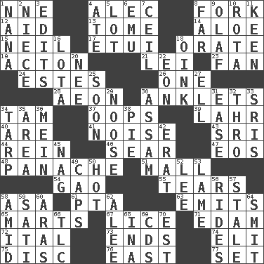 ACROSS 1. Compass dir. 4. Actor Baldwin 8. Tined utensil 12. Help 13. Heavy book 14. _ vera 15. Famous astronaut Armstrong 17. Needle case 18. Speak pompously 19. NE Massachussets city 21. Flowery wreath 23. Avid follower 24. _____ Park, CO 26. Single 28. Age 30. Short socks 34. Scottish cap 37. I made a mistake 39. Cowardly lion portrayer 40. "We ___ not amused" (Victoria) 41. Annoying sound 43. _ Lanka 44. It's straight from the horse's mouth 46. Burn superficially 47. Greek goddess of the dawn 48. Flamboyance 51. Shopping center 54. E Mali city 55. Pulls apart 58. White ___ sheet 61. Parent Teacher Assoc. 63. Gives off 65. Shops 67. Louse (plural) 71. Dutch treat 72. Slanted text style (abbr.) 73. Extremities 74. Connecticut Ivy Leaguer 75. Plate 76. Compass direction 77. Put into a specified state DOWN 1. Nanny 2. Sibling's daughter 3. Proofreads 4. Had dinner 5. Car dealer's back yard 6. Australian flightless bird 7. To provide with a ceiling 8. At a great distance 9. Norwegian king 10. Round or rotation of duties 11. Peachy ____! 16. Globular water bottle used in Asia 18. Pig sound 20. Born 22. Age 25. Within a short period 27. Pipe bend 29. Trap for birds or small mammals 30. Indian state 31. Relaxation 32. Through, poetically 33. Indian titles of respect 34. Canvas cover 35. Length times width 36. Chow _ 38. Sliced dessert 42. Part of Q.E.F. 45. Tired old horse 49. Balmoral and tarboosh 50. Being at a high temperature 52. Area sheltered from the wind 53. Unable to walk 56. Amusement-park features 57. Lacking originality or spontaneity 58. Among 59. Suttee (variant) 60. Ancient river in northeast Turkey 62. Toward shelter 64. Stricken, poetically 66. Affectionate concern, for short 68. _ tizzy (2 wds.) 69. Music discs 70. Eastern Standard Time (abbr.)