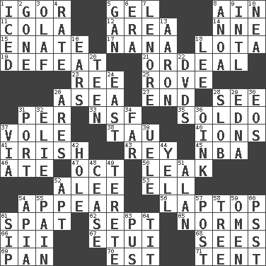 ACROSS 1. Russian composer Stravinsky 5. Set 8. The 18th letter of the Arabic alphabet 11. Root beer relative 12. Type of rug 14. Compass dir. 15. Maternal 17. Nanny 18. Globular water bottle used in Asia 19. Outscore 21. Severe or trying experience 23. To sift 25. Be footloose 26. Toward the sea 27. Conclude 28. Observe 31. For each 33. Science/research agcy. 35. Twentieth part of a lira 37. Short-tailed, large-bodied rat 38. The 19th letter of the Greek alphabet 40. Charged atoms 41. From or relating to Ireland 43. Marina Del _, California 45. Basketball assoc. 46. Had dinner 47. Sep. follower 50. Path through which fluid escapes 52. Toward shelter 53. Pipe bend 54. Become visible 56. Portable computer 61. Petty quarrel 62. Back-to-school mo. 65. Typical standards 66. One more than two 67. Needle holder 68. Observes 69. Baking dish 70. Eastern Standard Time (abbr.) 71. Portable shelter DOWN 1. On the rocks 2. Went 3. Norwegian king 4. Assign a rank or rating to 5. Separate the seeds from cotton 6. Period 7. Poe poem 8. Small Philippine buffalo 9. International (abbr.) 10. Teachers' org. 13. Composer Copland 16. Hearing organs 18. Area sheltered from the wind 20. Adolescent 22. Movie discs 24. Compass direction 26. Ancient Greek god of war 28. Messy guy 29. Pulitzer Prize-winning author Ferber 30. Greek goddess of the dawn 31. Sweet dark-red dessert wine 32. Writer Wiesel 34. Distant 36. Pig sound 37. By way of 39. Ubangi River tributary 42. Opening into or through something 44. Shout 48. Stop 49. Cigar-shaped 51. ____ Jay Lerner 52. Fitting 54. Capital of Western Samoa 55. Ache 57. Mail 58. Woody plant 59. Sign of something about to happen 60. Inconspicuous attention getter 61. Small drink 63. Purulenc 64. Teat (slang)