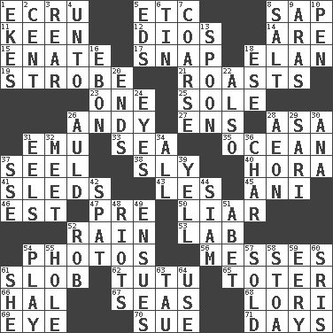 ACROSS 1. Shade of tan 5. And so on (abbr.) 8. Plant excrement 11. Peachy ____! 12. "Vaya con ____" 14. "We ___ not amused" (Victoria) 15. Maternal 17. Fastener 18. Flair 19. Disco prop 21. Exposes to great heat 23. Single 25. Not divided or shared with others 26. "60 Minutes" Commentator Rooney 27. Followers of ems 28. White ___ sheet 31. Australian flightless bird 33. Ocean 35. Sea 37. Stitch closed the eyes of (a falcon) 38. Stealthy 40. Israeli folk dance 41. Bobsleighs 43. French article 45. Cuckoo 46. Eastern Standard Time (abbr.) 47. Before (prefix) 50. One who doesn't tell the truth 52. Water falling in drops from the sky 53. Experiment locale 54. Pictures 56. Makes clutter 61. Messy guy 62. Ballerina skirt 65. Carrier 66. Actor Linden 67. Oceans 68. Australian parrot (variant) 69. Sight organ 70. Take to court 71. 24-hour periods DOWN 1. Makes supply last 2. Penny 3. Located in or toward the back 4. To (old English) 5. Begley and Asner 6. Shallow baking pan 7. Rough 8. Table seasoning 9. Ancient river in northeast Turkey 10. Writing instrument 13. Soup utensil 16. Inky black, to poets 18. Compass dir. 20. Extremities 22. In addition 24. Snake ____ (dice throw) 26. Old (Scot.) 28. A really long time 29. Indian skirt 30. Santa ___, CA 31. Snakelike fish 32. Rendezvous 34. Everything 36. Burn to charcoal 37. Compass dir. 39. Shout 42. Argument over a trivial matter 44. Thailand, formerly 48. Disturbances 49. Follows as a consequence or result 51. Collude with 52. Director Reiner 54. Live dramatic performance 55. Opening into or through something 57. Exchanged or delivered for money 58. Portico 59. Suggestive of the supernatural 60. Indian titles of respect 61. A female animal or person 63. The 19th letter of the Greek alphabet 64. Purpose