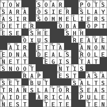 ACROSS 1. Pull behind 4. Fly high 8. Plant holders 12. "Two Mules for Sister ____" 14. Flexible twig of a willow tree 16. Kill 17. SW Saudi Arabia district 18. Wine waiters 20. Prevent from occurring 22. Chief or king in Benin or Nigeria 23. Elect 24. Compass dir. 25. A female animal or person 28. Quiet! 30. The longest river in Central Asia 31. Break or tear apart 35. Wind 37. Singer James 40. At once, immediately (arch.) 41. Pulitzer Prize-winning author Ferber 42. Allots cards 44. Hero or heavy, e.g. 45. Remaining after all deductions 46. Armor plate that protects the chest 47. Make lace 48. Snob 50. Nuclear Threat Initiatives 52. Reproach for some lapse or misdeed 54. Eastern Standard Time (abbr.) 55. White ___ sheet 58. Put into a specified state 61. On the contrary 63. Table seasonings 65. Interpreter 70. Oceans 71. Helper 72. N. Chile seaport 73. Whimper 74. Egg locale 75. False hair 76. Nine, plus one DOWN 1. Sadhe (variant) 2. Fertile tracts in a desert 3. Compose 4. Distress signal 5. Bear (Spanish) 6. Direct toward a target or goal 7. San ____ (Riviera town) 8. Air pressure measure (abbr.) 9. Margarine 10. Canvas cover 11. System (abbr.) 13. "We ___ not amused" (Victoria) 15. Confederate soldiers (slang) 19. Cowardly lion portrayer 21. Acura sports coupe 26. Became colored 27. First name in cosmetics 29. Centers of feelings and intuitions 30. Speaker 32. Small Philippine buffalo 33. Electrical Unit 34. Compass dir. 35. Arabian gulf 36. To the inside or interior of 38. Label 39. Place in a line 41. Followers of ems 43. Fast planes 49. Bar bills 51. ___ a Wonderful Life 53. Monetary unit of Botswana 55. Eskimo relative 56. Lacking originality or spontaneity 57. NE Netherlands city 58. Comedian Laurel of Laurel & Hardy 59. 4th largest of the Great Lakes 60. Bits 62. Small pie 64. Viper 66. Fish or hair follower 67. Neckwear 68. Sep. follower 69. Actress Charlotte