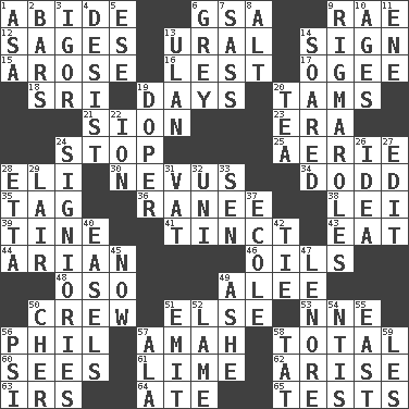 ACROSS 1. Tolerate 6. Girls' org. (abbr.) 9. Actress Charlotte 12. Gurus 13. Mountain range 14. Omen 15. Came up 16. For fear that 17. Double curve, resembling the letter S 18. _ Lanka 19. 24-hour periods 20. Scottish caps 21. The Jewish people; Israel 23. Period 24. Obstruct or block passage 25. Nest on high 28. Biblical high priest 30. Congenital growth or mark on the skin 34. Texas town _ City 35. Label 36. Indian princess (variant) 38. Flowery wreath 39. Prong on a fork 41. Colored lightly or faintly 43. Ingest 44. Believer in; advocate of (suffix) 46. Petroleums 48. Bear (Spanish) 49. Toward shelter 50. Group working together 51. Otherwise 53. Compass dir. 56. Silvers or Donahue 57. Nanny 58. "_____ Recall" 60. Perceives with the eye 61. Welles in "The Third Man" 62. Get up 63. Big collection agency 64. Had dinner 65. Trials DOWN 1. White ___ sheet 2. Taverns 3. Composer Stravinsky 4. Stop 5. Compass dir. 6. Jennifer or Joel 7. Backtalk 8. The first octave above the treble staff 9. Frustrating wastes of time 10. Eons 11. Compass dir. 13. Uhlan (variant) 14. Flew 19. Drug addict 20. Beverage made from leaves 22. Electrically charged atom 24. Seigniories (variant) 26. It may be bright or harebrained 27. Prepare for publication 28. Singer James 29. Den 31. Large container 32. Single; one (prefix) 33. Elected rep. 37. Learning spot: Fr. 40. Artist's stands 42. Standoff 45. At this time 47. Poe poem 49. American tennis player Robert 50. "Mermaids" star 51. Send forth 52. Unable to walk 54. Nuclear Threat Initiatives 55. 90 degrees 56. 23rd letter of the Greek alphabet 57. Insect wing 58. Make lace 59. French article