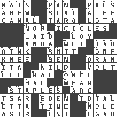 ACROSS 1. Floor protectors 5. Baking dish 8. Friends 12. Afresh 13. Narrow board 15. Toward shelter 16. Lessep's creation 18. Pacific island yam 19. Globular water bottle used in Asia 20. Not either 22. Winter's stalactites 24. Put down 26. Myrna of the movies 27. Small Philippine buffalo 28. Soggy 29. Bit 32. Pig sound 35. Stricken, poetically 37. Single 38. Leg joint 39. Elected rep. 40. Northwest Algerian city 41. Call ___ day 42. Uncontrolled 43. Electrical Unit 44. Pipe bend 45. Actress Charlotte 46. Single time 49. Actor Linden 50. Erode 51. Paper fasteners 55. Curve 56. Russian ruler of old 57. Paradise 59. Add up to 63. Singer James 64. Prong on a fork 65. Undercover agent 66. SW Saudi Arabia district 67. Eastern Standard Time (abbr.) 68. Mild oath DOWN 1. Apple computer (short form) 2. Santa ___, CA 3. Nine, plus one 4. Tchaikovsky ballet 5. Pacific Standard Time (abbr.) 6. Mountain range southwest of Kyrgyzstan 7. Drug cop 8. Friendly 9. _ vera 10. Allows 11. Ocean 14. Bathroom 17. Grant temporary use of 21. _ de Janeiro 23. Small bed 25. Hyrax 28. Light entry point 29. "Corrida" creature 30. Of or related to the anus 31. Scratch 32. Migrant worker of the '30s 33. International (abbr.) 34. Anneal 36. Cartoonist voice _ Blanc 40. Conquer 42. Place for singles 45. Hit sharply and swiftly 47. Teachers' org. 48. Haul 49. Ethiopian city, capital of Harari 51. Fast planes 52. Jacques of French films 53. Singer Brickell 54. Elected reps. 56. Beverage made from leaves 58. Fish or hair follower 60. Coat; cloak 61. According to 62. Directed