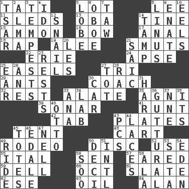 ACROSS 1. Jacques of French films 5. Car dealer's back yard 8. Area sheltered from the wind 11. Bobsleighs 13. Chief or king in Benin or Nigeria 14. Prong on a fork 15. ID or VA city 16. Arrow shooter 17. Of or related to the anus 18. Hit sharply and swiftly 19. Toward shelter 21. Particles of soot 22. 4th largest of the Great Lakes 24. Domed church section 25. Artist's stands 27. Three (prefix) 29. Pismires 30. Team commander 32. Repose 33. Having winglike extensions 35. Hindu god of fire 39. Echolocation 41. Undersized animal 42. Keyboard key 43. Food holders 45. Portable shelter 48. Draw slowly or heavily 49. Cowboy competition 50. Plate 52. Purpose 55. Slanted text style (abbr.) 56. Elected rep. 57. Having ears or earlike features 59. Small valley 60. Sep. follower 61. Chalkboard 62. Compass dir. 63. Petroleum 64. ____ Jay Lerner DOWN 1. Russian ruler of old 2. _ mater 3. Storms 4. Wedding promise 5. Ear part 6. Mitch Miller's instrument 7. The 23rd letter of the Hebrew alphabet 8. "_ and Lucy" (Charlie Brown theme song) 9. Related on the mother's side 10. Snakelike fish 12. Slow-paced one 14. Pack (down) 20. French article 21. Ketch in the Levant 23. Musical pauses 25. Hearing organ 26. One (Scot) 27. Small child 28. Actress Charlotte 30. Automobile 31. Ethiopian city, capital of Harari 33. Santa ___, CA 34. Experiment locale 36. From the throat 37. Compass dir. 38. It is 40. Von Bismarck 43. Personal Computers (abbr.) 44. Shoestrings 45. Hauls 46. Peak District village in England 47. 1994 drama film starring Jodie Foster 49. Travel on or in a vehicle 50. Tenth: prefix 51. International (abbr.) 53. Bristle 54. Genesis locale 56. "Barney Miller" actor Jack 58. Wing