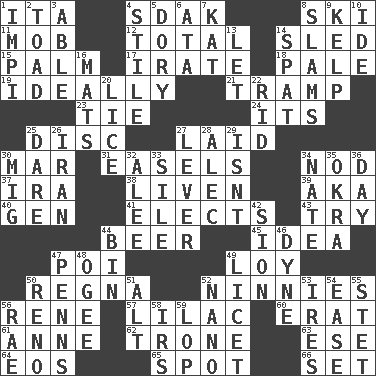 ACROSS 1. Call ___ day 4. Neighbor of Neb. 8. What Jean-Claude Killy likes to do 11. Crowd into 12. "_____ Recall" 14. Downhill vehicle 15. Inside of hand 17. Feeling or showing extreme anger 18. Light colored 19. Under perfect conditions 21. _____ steamer (cargo ship) 23. Make a knot 24. ___ a Wonderful Life 25. Plate 27. Put down 30. Impair 31. Artist's stands 34. Allow head to fall sleepily 37. Lyricist Gershwin 38. Make or become more lively 39. Alias (abbr.) 40. Commissioned mil. rank 41. Chooses 43. Attempt to accomplish something 44. Fermented drink made from hops 45. The content of cognition 47. Luau course 49. Myrna of the movies 50. Rain (Swedish) 52. Fools 56. French philosopher Descartes 57. Pale purple color 60. Part of Q.E.F. 61. Singer Murray 62. Heavy duty weighing machine 63. Compass dir. 64. Greek goddess of the dawn 65. Specific locale 66. Put into a specified state DOWN 1. Body of Kaffir warriors 2. Frog relative 3. Competent 4. Vertical member of a panel or frame 5. Dinghy 6. "One Day ___ Time" 7. Krazy ___ of comics 8. Hits or strikes with great force 9. Seaweed 10. Binary compound 13. Allow 14. Petty quarrel 16. Floor coverings 20. Louse (plural) 22. To free from 25. Have the gumption 26. SW Asia republic 27. Crowbar 28. Actor Baldwin 29. Is not 30. Russian fighter aircraft 32. Toward shelter 33. Drop; flow; fall 34. Nathan's nickname 35. Gumbo ingredient 36. 24 hours 42. The Jewish people; Israel 44. Storage container 46. Centimeter-gram-second unit of force 47. Actor Sean's family 48. Double curve, resembling the letter S 49. It is permitted: Lat. 50. Western Nevada city 51. Keyboard modifier key 52. Billionth: prefix 53. Angers 54. Comfort 55. Proofreading order 56. Actress Charlotte 58. Big collection agency 59. Chop off