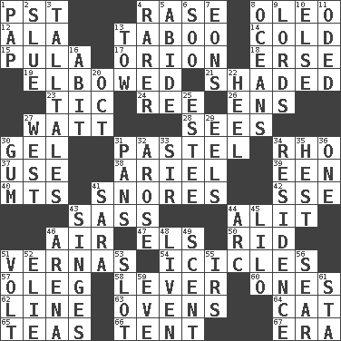 ACROSS 1. Pacific Standard Time (abbr.) 4. To erase 8. Margarine 12. In the manner of 13. Off limits 14. Lacking warmth 15. Monetary unit of Botswana 17. Greek mythologigal hunter 18. Celtic language 19. Shoved, as through a crowd 21. Cast a shadow over 23. Nervous spasm 24. To riddle 26. Followers of ems 27. Electrical Unit 28. Observes 30. Set 31. Soft color 34. 17th letter of the Greek alphabet 37. Purpose 38. Satellite of Uranus 39. Car or cant ending 40. Mountains (abbr.) 41. Sounds asleep 42. Compass dir. 43. Backtalk 44. Came down and settled, as after flight 46. Wind 47. Raised railways 50. To free from 51. Actresses Bloom and Felton 54. Winter's stalactites 57. Cassini of fashion 58. Prying instrument 60. Washington bills 62. Actor's bit 63. Baking chambers 64. Feline 65. Afternoon social gatherings 66. Portable shelter 67. Period DOWN 1. Infant food 2. Turn sharply 3. Baron Munchausen's specialties 4. More uncommon 5. Stay 6. "Barney Miller" actor Jack 7. Immeasurably long periods of time 8. Seas 9. Titled peers of a realm 10. Otherwise 11. Wrote a lyric poem 13. Pull behind 16. "This won't hurt ____!" 20. Sep. follower 22. Person who is morally reprehensible 25. First name in cosmetics 27. Compass direction 29. Snakelike fish 30. Chewing product 31. Baking dishes 32. Came up 33. Title for a knight 34. Dwelling 35. Behest 36. Single 41. "Two Mules for Sister ____" 43. Burns superficially 44. Curve 45. _ and Stitch 46. Sports stadium 48. Make or become more lively 49. Odor 51. Electrical Unit 52. Writer Wiesel 53. Notch 55. Big collection agency 56. Singe 59. Night before a holiday 61. R.R. building