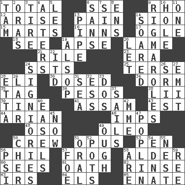ACROSS 1. "_____ Recall" 6. Compass dir. 9. 17th letter of the Greek alphabet 12. Ascend 13. Ache 14. The Jewish people; Israel 15. Shops 16. Lodging establishments 17. Stare at amorously 18. Observe 19. Domed church section 20. Unable to walk 21. Cause heat under the collar 23. Epoch 24. Fast planes 25. Laconic 28. Connecticut Ivy Leaguer 30. Administered medicine 34. Dormintory (informal) 35. Label 36. Mexican monetary units 38. Cards in a Roman deck? 39. Prong on a fork 41. Indian state 43. Eastern Standard Time (abbr.) 44. Believer in; advocate of (suffix) 46. Naughty children 48. Bear (Spanish) 49. Margarine 50. Group working together 51. Musical composition 53. Fenced enclosure 56. Silvers or Donahue 57. Tree-dwelling hopper 58. Tree or shrub in the Birch family 60. Observes 61. Pledge 62. Remove soap 63. Big collection agency 64. Raised railways 65. Maternal DOWN 1. Scottish cap 2. Mouths or openings 3. Hoop that covers a wheel 4. Michaelmas daisies 5. French article 6. Without 7. Trig term 8. Followers of ems 9. Frustrating wastes of time 10. Hollow 11. Single 13. Corncob 14. Flew 19. Columnist Joseph or Stewart 20. Allow 22. It would 24. Seigniories (variant) 26. Indian titles of respect 27. Send forth 28. Singer James 29. Den 31. Ocean 32. Double-curved letter 33. Two (Sp.) 37. Moves on water 40. Artist's stands 42. Madame (abbr.) 45. At this time 47. Cotton for raincoats, e.g. 49. Ending for "Through" and "Enough" 50. "Mermaids" star 51. Spoken 52. Plant holders 54. Pulitzer Prize-winning author Ferber 55. A home for chicks 56. Air pressure measure (abbr.) 57. Enemy 58. "We ___ not amused" (Victoria) 59. Portuguese money of account (variant)