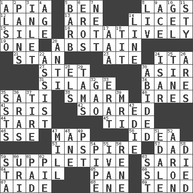 ACROSS 1. Capital of Western Samoa 5. Benjamin's nick name 8. Fails to keep up a pace 12. Long (Scottish) 13. "We ___ not amused" (Victoria) 14. It is permitted: Lat. 15. Filth; sediment 16. Rotating or pertaining to rotation 19. Single 20. Choose not to consume 21. Comedian Laurel of Laurel & Hardy 23. Had dinner 24. Call ___ day 27. Proofreading order 30. SW Saudi Arabia district 31. Fodder prepared in a silo 34. Object of repulsion 35. Suttee (variant) 38. Excessive but superficial compliments 40. Angers 41. Indian titles of respect 42. Flew 44. Small pie 45. Periodic rise and fall of the sea level 46. Compass dir. 47. Atlas unit 50. The main thing one is thinking about 53. Heighten or intensify 57. Male parent 59. Supplying deficiencies 63. Indian skirt 64. Lag or linger behind 65. Baking dish 66. _ gin 67. Assistant 68. Compass dir. 69. Watch over DOWN 1. In addition 2. Aches 3. An arm off of a larger body of water 4. Personal question 5. Sharp remark 6. Greek god of love 7. Remaining after all deductions 8. 54 in ancient Rome 9. Adept person 10. Set 11. Filthy place 14. Actor's bit 17. Auto club (abbr.) 18. Teat (slang) 20. Opposed to 22. Aid 24. Austrian river, tributary to the Danube 25. Prong on a fork 26. Ancient Greek god of war 28. Raised railways 29. Scottish caps 30. Remained 32. E Mali city 33. Part of Q.E.F. 35. Fast planes 36. Ancient river in northeast Turkey 37. Become fatigued 39. Medical imaging device (abbr.) 43. Singer Brickell 47. Place where flour is made 48. A saturated hydrocarbon 49. Pacific Standard Time (abbr.) 51. Peak District village in England 52. Composer Copland 54. Corncob 55. "Terrible" tsar 56. French philosopher Descartes 58. Passed on 59. R.R. building 60. RI univ. 61. Writing tablet 62. Sliced dessert 63. Fast jet (abbr.)