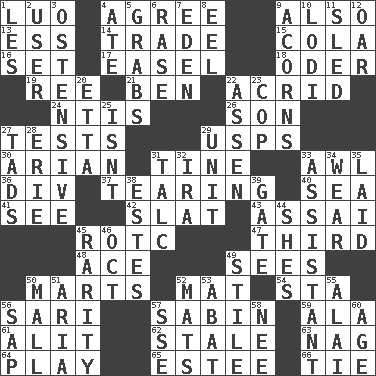 ACROSS 1. Nilotic language 4. Match 9. In addition 13. Double-curved letter 14. Barter 15. Root beer relative 16. Put into a specified state 17. Artist's stand 18. River in Europe 19. Portuguese money of account (variant) 21. Benjamin's nick name 22. Sour-tasting 24. Nuclear Threat Initiatives 26. Male offspring 27. Trials 29. United States Postal Service (abbr.) 30. Believer in; advocate of (suffix) 31. Prong on a fork 33. Leather borer 36. HTML Container Element 37. Rending 40. Ocean 41. Perceive with the eye 42. Narrow board 43. Slender Brazilian palm 45. College mil. group 47. One of three equal parts 48. Adept person 49. Observes 50. Shops 52. Floor covering 54. R.R. building 56. Indian skirt 57. Unit of acoustic absorption 59. Chicken ___ king 61. Set down 62. Lacking originality or spontaneity 63. Tired old horse 64. Romp 65. First name in cosmetics 66. Neckwear DOWN 1. French article 2. One who makes use of a thing 3. Clearly or manifestly demonstrative 4. Had dinner 5. Seizes 6. Raze (variant) 7. Locale of original sin 8. Snakelike fish 9. Oak nuts 10. Farming town in central California 11. Downhill vehicle 12. Boat paddle 20. Singer James 22. NE Netherlands city 23. Police officer (slang) 25. Is not 27. Bits 28. 4th largest of the Great Lakes 29. A single undivided whole 31. Baby powder 32. Retirement account (abbr.) 33. Aide 34. Erode 35. Put down 38. _____ Park, CO 39. Yard entry 44. "______ My Girl" (Turtles hit) 45. Noteworthy scarcity 46. Sep. follower 49. Vertical member of a panel or frame 50. Promenade 51. Roberta Peters solo 52. Floor coverings 53. Blind as ____ 55. Jai _ 56. Plant excrement 57. Compass dir. 58. Born 60. Mature