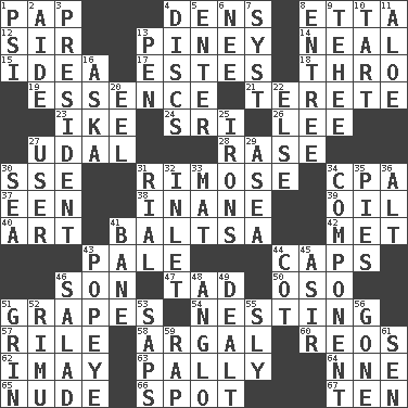 ACROSS 1. Infant food 4. Cub Scout units 8. Singer James 12. Title for a knight 13. Abounding in pines 14. Actress Patricia 15. The main thing one is thinking about 17. _____ Park, CO 18. Through, poetically 19. Center 21. Cigar-shaped 23. Mamie's mate 24. Indian title of respect (Mr.) 26. Area sheltered from the wind 27. Freehold land 28. Raze (variant) 30. Compass dir. 31. Full of chinks, cracks, or crevices 34. Tax preparer (abbr.) 37. Car or cant ending 38. Empty; void 39. Petroleum 40. Nonscientific branch of learning 41. Greek mezzo-soprano Agnes 42. Was introduced to 43. Diluted with white 44. Balmoral and tarboosh 46. Male child 47. Small amount or degree 50. Bear (Spanish) 51. Raisin fruits 54. Inhabiting a nest 57. Cause heat under the collar 58. Therefore, facetiously 60. Vintage cars 62. "If ____ say so..." 63. Chummy 64. Compass dir. 65. Naked 66. Blemish 67. "___ Little Indians" DOWN 1. Air pressure measure (abbr.) 2. Helper 3. Elected leader of a country 4. Plates 5. Keyboard key 6. Born 7. System (abbr.) 8. Main course 9. Giggle 10. Small pie 11. _ vera 13. Writing instrument 16. "____ silly question..." 20. Snakelike fish 22. Otherwise 25. Removes the wrinkles 27. One who makes use of a thing 29. Toward the sea 30. Ocean 31. Monetary unit of Yemen 32. An arm off of a larger body of water 33. Floor protector 34. Piece 35. Sliced desserts 36. The first octave above the treble staff 41. Object of repulsion 43. Wimpy's pal 44. Small bed 45. SW Saudi Arabia district 46. Vegetable dish 48. White American of non-Hispanic descent 49. Started a card game 51. Amused look 52. Tall New Zealand timber tree 53. Plant excrements 55. Cunning 56. Went 59. Strike 61. Elected rep.