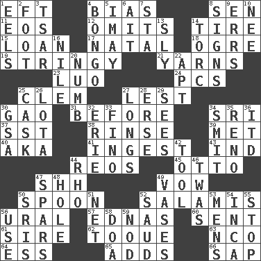 ACROSS 1. Lizard (obsolete) 4. Prejudice 8. Elected rep. 11. Greek goddess of the dawn 12. Leaves out 14. Hoop that covers a wheel 15. Grant temporary use of 17. Brizilian seaport 18. Legendary monster 19. Slender, wiry 21. Entertaining tales 23. Nilotic language 24. Personal Computers (abbr.) 25. Clement's nick name 27. For fear that 30. E Mali city 31. Prior to 34. _ Lanka 37. Fast jet (abbr.) 38. Wash lightly 39. Was introduced to 40. Alias (abbr.) 41. Consume 43. Indiana (abbr.) 44. Vintage cars 45. Von Bismarck 47. Quiet! 49. Solemn pledge 50. Soup utensil 52. Deli grouping 56. Mountain range 57. Ferber et al. 60. Emitted 61. Beget 62. Woman's close-fitting hat 63. Non-commissioned officer (abbr.) 64. Double-curved letter 65. Sums up 66. Plant excrement DOWN 1. Snakelike fish 2. One third of a yard 3. Russian ruler of old 4. Beat drum 5. "If ____ say so..." 6. Small island 7. R.R. building 8. Public displays of written messages 9. Blunders 10. Born 13. Cunning 14. Torque (variant) 16. The longest river in the world 20. Unfeeling 22. Fitting 25. Keg 26. Globular water bottle used in Asia 27. Yearns 28. Celtic language 29. Observes 30. Girls' org. (abbr.) 32. 4th largest of the Great Lakes 33. Fine (Spanish) 34. Stricken, poetically 35. Former U.S. Attorney General Janet 36. It would 42. Instrument 44. 17th letter of the Greek alphabet 46. It was, poetically 47. Practice fights 48. Opening into or through something 49. Flower holders 50. Indian titles of respect 51. Fish or hair follower 52. Saudi Arabian king (1953-1964) 53. Not women's 54. South American Indian 55. Constrict 56. Purpose 58. ___ good deed 59. Lower and raise head in agreement