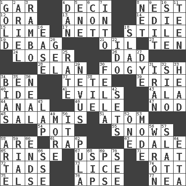 ACROSS 1. Slender fish 4. Tenth: prefix 8. A home for chicks 12. Mouth or opening 13. Soon (poet.) 14. Singer Brickell 15. Welles in "The Third Man" 17. Remaining after all deductions 18. Vertical member of a panel or frame 19. Debunk (Brit. slang) 21. Petroleum 23. Nine, plus one 24. Failure 26. June honoree 28. Liveliness 30. Out of fashion; old fashioned 34. Benjamin's nick name 37. Wig 39. One of the Great Lakes 40. Binary compound 41. Vices 43. Chicken ___ king 44. Of or related to the anus 46. Ubangi River tributary 47. Allow head to fall sleepily 48. Deli grouping 51. Smallest unit of an element 54. Cooking vessel 55. Frozen precipitation (plural) 58. "We ___ not amused" (Victoria) 61. Reproach for some lapse or misdeed 63. Peak District village in England 65. Remove soap 67. United States Postal Service (abbr.) 71. Part of Q.E.F. 72. Small amounts or degrees 73. Louse (plural) 74. Baseball player Mel 75. Otherwise 76. Domed church section 77. Teachers' org. DOWN 1. Gilded 2. Satellite of Uranus 3. Role for Stallone 4. Daniel's nick name 5. Compass dir. 6. Small bed 7. To the inside or interior of 8. Fish or hair follower 9. Prepare for publication 10. Drop; flow; fall 11. Adolescent 16. Comfort 18. Volcanic refuse 20. Set 22. Wedding promise 25. Pace 27. Color 29. Congenital growth or mark on the skin 30. Chap (slang) 31. SW Asia republic 32. Grain storage tower 33. Froth on beer 34. Prejudice 35. Pulitzer Prize-winning author Ferber 36. Anneal 38. Make a knot 42. Puts into a specified state 45. Pet locale 49. Greater amount 50. Call ___ day 52. Single 53. Method 56. Make _____ (do battle with) 57. Schedule 58. Johnson of "Laugh-In" 59. Monetary unit of Yemen 60. Extremities 62. Monetary unit of Botswana 64. Singer James 66. Compass dir. 68. Small drink 69. Personal Computers (abbr.) 70. Perceive with the eye