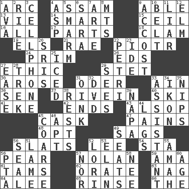 ACROSS 1. Curve 4. Indian state 9. Competent 13. Compete 14. Don Adams' spy role 15. To provide with a ceiling 16. 100% 17. Components 18. Burrowing marine mollusk 19. Raised railways 21. Actress Charlotte 22. Peter (Polish) 24. Demure 26. Begley and Asner 27. Value system 29. Proofreading order 30. Came up 31. River in Europe 33. The 18th letter of the Arabic alphabet 36. Elected rep. 37. Popular '50s hangout 40. What Jean-Claude Killy likes to do 41. Make supply last 42. Conclusions 43. Columnist Joseph or Stewart 45. Keg 47. Aches 48. Elect 49. Sinks 50. Narrow boards 52. Area sheltered from the wind 54. R.R. building 56. Lightbulb-shaped fruit 57. Pitcher Ryan 59. Nursemaid (var.) 61. Scottish caps 62. Declaim 63. Tired old horse 64. Toward shelter 65. Wash lightly 66. Definite Article DOWN 1. Actress Gardner 2. Cause heat under the collar 3. Portable communications device 4. Viper 5. Excessive but superficial compliments 6. "Two Mules for Sister ____" 7. Johnson of "Laugh-In" 8. Mountains (abbr.) 9. Buttonhole 10. Waist strap 11. One who doesn't tell the truth 12. Shade tree 20. Indian titles of respect 22. _ dish (used to culture cells) 23. Binary compound 25. On the rocks 27. Comfort 28. Long journey 29. Observes 31. Pig sound 32. Movie disc 33. Aide 34. Visual representation of an object 35. Cuts off 38. Musical pauses 39. California wine valley 44. Falls behind 45. Unrefined 46. Fitting 49. Theater features 50. Lick closed 51. Unable to walk 52. Australian parrot (variant) 53. Enthusiasm 55. Nanny 56. Parent Teacher Association (abbr.) 57. Or not 58. Born 60. Grow older