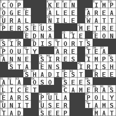ACROSS 1. Police officer (slang) 4. Peachy ____! 8. Mischievous child 11. Double curve, resembling the letter S 13. Toward shelter 14. Length times width 15. Mountain range 16. "Death on the ____" 17. Electrical Unit 18. Son of Zeus who helped slay Medusa 21. Distance measurement (Brit.) 22. Pulitzer Prize-winning author Ferber 23. Whopper 25. A really long time 26. Title for a knight 29. What propaganda does 32. Inclined to pout 34. "We ___ not amused" (Victoria) 35. Afternoon social gathering 38. Queen of England 1702-14 39. Titles for men of rank and authority 41. Naughty children 43. R.R. building 44. Followers of ems 45. From or relating to Ireland 46. Most dubious of character or honesty 50. To separate or throw off 51. In the manner of 54. Bear (Spanish) 55. Observes 57. It is permitted: Lat. 59. Devices for capturing images 63. Hearing organs 64. Monetary unit of Botswana 67. More than one (prefix) 68. A single undivided whole 69. One who makes use of a thing 70. Scottish caps 71. Small boy 72. Ooze 73. Floor covering DOWN 1. Overturn; upset 2. Legendary monster 3. Lightbulb-shaped fruit 4. Sunflower state 5. Connecticut Ivy Leaguer 6. Snakelike fish 7. Born 8. Feeling or showing extreme anger 9. Paris' subway 10. Eucharist need 12. Otherwise 14. Deep reverence 19. Whirlpool 20. Single; one (prefix) 21. Was introduced to 23. Old wives' tales, e.g. 24. Angers 26. Health resort 27. Charged particles 28. Undersized animal 30. Tarsus (plural) 31. Use a swizzle stick 33. Beverages made from leaves 36. Independent ruler or chieftain 37. Domed church section 39. Oceans 40. _ china 42. A female animal or person 45. Detail 47. Being at a high temperature 48. Fortification 49. Ocean 51. Native American of Southwest Alaska 52. Climbing, woody, usually tropical vines 53. Bitter 56. Back-to-school mo. 58. Eastern Standard Time (abbr.) 60. Wander aimlessly 61. _ mater 62. System (abbr.) 64. Ichor 65. Purpose 66. Area sheltered from the wind