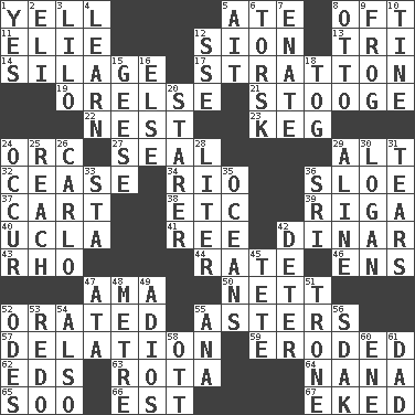 ACROSS 1. Shout 5. Had dinner 8. Often (poetically) 11. Writer Wiesel 12. The Jewish people; Israel 13. Three (prefix) 14. Fodder prepared in a silo 17. Ski resort town in Vermont 19. Threatening words 21. Moe Howard, for one 22. Egg locale 23. Cask 24. The grampus (Milton) 27. Lick closed 29. Keyboard modifier key 32. Stop 34. River (Sp.) 36. _ gin 37. Heavy open wagon 38. And so on (abbr.) 39. Capital of Latvia 40. Southern CA. univ. 41. To separate or throw off 42. Middle Eastern gold or silver currency 43. 17th letter of the Greek alphabet 44. Pace 46. Followers of ems 47. Housemaid (var.) 50. Remaining after all deductions 52. Spoke pompously 55. Michaelmas daisies 57. Conveyance 59. Eaten away 62. Begley and Asner 63. Roll call or roster of names 64. Grandmother 65. "Barney Miller" actor Jack 66. Eastern Standard Time (abbr.) 67. Made supply last DOWN 1. It is so 2. Biblical high priest 3. _ and Stitch 4. Memorize 5. Small island 6. Cod relative 7. Maternal 8. "Beetle Bailey" pooch 9. Toadlike animal 10. Prong on a fork 12. Compass dir. 15. Honkers 16. Otherwise 18. Coat; cloak 20. A viewer who gazes fixedly 24. Come to pass 25. Arrive at 26. Monte _, Las Vegas Hotel/Casino 28. 61 cubic inches 29. Place in a line 30. Utah city north of Ogden 31. Pulls into pieces 33. R.R. building 35. Seas 36. _ Lanka 42. Prevent from occurring 45. False hair 47. _ moment's notice (2 wds.) 48. Distance measurement (Brit.) 49. Goodbye (Sp.) 51. Heavy duty weighing machine 52. Lyric poems 53. Do over again 54. In addition 55. Santa ___, CA 56. Neighbor of Neb. 58. Baseball player Mel 60. Compass dir. 61. Male parent