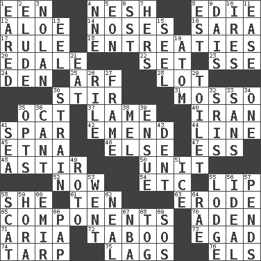 ACROSS 1. Car or cant ending 4. Delicate 8. Singer Brickell 12. _ vera 14. Olfactory organs 16. "Two Mules for Sister ____" 17. General guideline 18. Pleas 20. Peak District village in England 22. Arrange properly for use 23. Compass dir. 24. Lair 25. Sandy's bark 28. Car dealer's back yard 30. Use a swizzle stick 31. With motion or animation 35. Sep. follower 37. Unable to walk 40. SW Asia republic 41. Practice fight 42. Make improvements or corrections to 44. Actor's bit 45. Inactive volcano in Sicily 46. Otherwise 47. Curvy letter 48. Having gotten out of bed 50. A single undivided whole 52. Immediately 54. And so on (abbr.) 55. Mouth edge 58. A female animal or person 61. "___ Little Indians" 63. Eat (away) 65. Pieces 70. Arabian gulf 71. Roberta Peters solo 72. Off limits 73. Mild oath 74. Canvas cover 75. Falls behind 76. Raised railways DOWN 1. Having ears or earlike features 2. Dodge 3. Pitcher Ryan 4. Compass dir. 5. Period of immesurable duration 6. Fast jet (abbr.) 7. Possessive pronoun 8. Eastern Standard Time (abbr.) 9. Raised platform 10. Angers 11. Comfort 13. Snakelike fish 15. Stitch closed the eyes of (a falcon) 19. Tiny particle 21. Consume 26. Cause heat under the collar 27. Movie unit 29. Bathroom 30. Put through a sieve 32. Indian titles of respect 33. Without 34. Single 35. Elects 36. Patter 38. Cartoonist voice _ Blanc 39. Follow as a consequence or result 41. Ocean 43. Scratch 49. Printing process, for short 51. Frozen water 53. Gone 55. Inn 56. Standard of perfection 57. Depends 58. Jazz singing style 59. Israeli folk dance 60. Independent ruler or chieftain 62. Be tempered by heat 64. Actress Charlotte 66. Infant food 67. Basketball assoc. 68. Coat; cloak 69. Mayday
