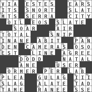 ACROSS 1. By way of 4. _____ Park, CO 9. Hearing organs 13. ___ a Wonderful Life 14. Derisive sound 15. Narrow board 16. Mountains (abbr.) 17. Father Junipero _ 18. Municipality 19. Petroleum 21. Greek goddess of the dawn 22. Schedule 24. Fly high 26. Atmosphere 27. Add up to 29. Sever or remove by pinching or nipping 30. Silly 31. "This won't hurt ____!" 33. Baking dish 36. Lair 37. Devices for capturing images 40. Bear (Spanish) 41. Eastern Standard Time (abbr.) 42. Actor's bit 43. Match 45. Texas town _ City 47. Brizilian seaport 48. A saturated hydrocarbon 49. One who uses or employs something 50. Abalone 52. For each 54. Experiment locale 56. Entreaty 57. Russian prison camp 59. One more than two 61. Volcanic refuse 62. Having winglike extensions 63. Bit 64. Docile 65. The wife of a rajah (variant) 66. Compass dir. DOWN 1. Zeal 2. "Tell ____ the Marines!" 3. Helper 4. Curvy letter 5. Scornful expression 6. "Corrida" creature 7. Blunders 8. R.R. building 9. Fortification 10. Set down 11. Assign a rank or rating to 12. Filthy place 20. Grant temporary use of 22. Before Barbara or Clara 23. Cards in a Roman deck? 25. Actor Baldwin 27. Event that recurs at intervals 28. Washington bills 29. Title for a man of rank and authority 31. Among 32. Benjamin's nick name 33. Likenesses of persons 34. At sea 35. Christmas carol 38. Tree or shrub in the Birch family 39. Without 44. Highlander 45. Break 46. Single 49. A salt of uric acid 50. Spanish pot 51. 480, 500 or 516 sheets of paper 52. Monetary unit of Botswana 53. Enthusiasm 55. Prejudice 56. Pacific Standard Time (abbr.) 57. Slender fish 58. Unit of force equal to gravity 60. Binary compound
