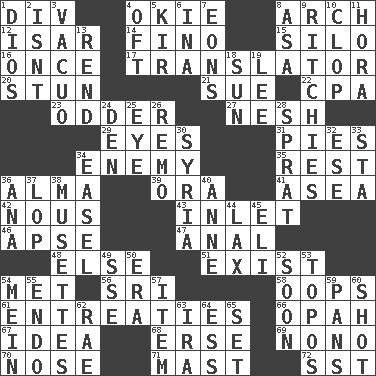 ACROSS 1. HTML Container Element 4. Migrant worker of the '30s 8. Bowlike part 12. Austrian river, tributary to the Danube 14. A pale, very dry sherry 15. Grain storage tower 16. At one time in the past 17. Interpreter 20. Astound 21. Take to court 22. Numbers guy (abbr.) 23. More peculiar 27. Tender 29. Sight organs 31. Sliced desserts 34. Foe 35. Take ten 36. _ mater 39. Mouth or opening 41. Toward the sea 42. Horse sense 43. An arm off of a larger body of water 46. Domed church section 47. Of or related to the anus 48. Otherwise 51. Be extant 54. Was introduced to 56. Indian title of respect (Mr.) 58. I made a mistake 61. Pleas 66. Brightly colored fish 67. The content of cognition 68. Celtic language 69. Words to Nanette 70. Sense of smell 71. Vertical spar for supporting sails 72. Fast jet (abbr.) DOWN 1. "Vaya con ____" 2. Is not 3. In a vacuum (with "in") 4. Often (poetically) 5. Apertif with cassis 6. _ tizzy (2 wds.) 7. Immeasurably long periods of time 8. White ___ sheet 9. Actors Guy, Robert Welles, and Clint 10. Hoof sound 11. Israeli folk dance 13. Tear apart 18. Player for Phoenix 19. Area sheltered from the wind 24. Lair 25. Sight organ 26. San ____ (Riviera town) 28. Small fatty European fish 30. Damascus' land 32. Compass dir. 33. R.R. building 34. Artist's stand 36. Santa ___, CA 37. Chop off 38. French bagpipes 40. Queen of England 1702-14 44. Not strict 45. Biblical high priest 49. Compass dir. 50. Epoch 52. Within a short period 53. Traditional theme or motif 54. Chow _ 55. Inside; within (prefix) 57. Detail 59. Zero-star reviews 60. Went for two points 62. Actress Charlotte 63. Retirement account (abbr.) 64. Double-curved letter 65. Arrange properly for use