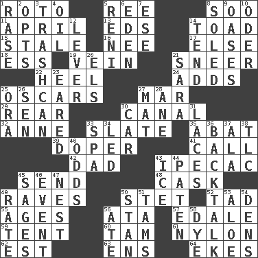 ACROSS 1. Printing process, for short 5. To riddle 8. "Barney Miller" actor Jack 11. Showery time 13. Begley and Asner 14. Frog relative 15. Showing deterioration from age 16. Born 17. Otherwise 18. Curvy letter 19. Distinctive style or manner 21. Scornful expression 22. The bottom of a shoe or boot 24. Does sums 25. Motion picture awards 27. Spoil 29. Tail end 30. Lessep's creation 32. Queen of England 1702-14 33. Schedule 35. Blind as ____ 39. Drug addict 41. Give a ring to 42. June honoree 43. Medicinal drug used to evoke vomiting 45. Post 48. Keg 49. All-night dance parties 50. Proofreading order 52. Small amount or degree 55. Eras 56. "One Day ___ Time" 57. Peak District village in England 59. Portable shelter 60. Scottish cap 61. Thermoplastic polyamide 62. Eastern Standard Time (abbr.) 63. Followers of ems 64. Supplements with great effort DOWN 1. To erase 2. Chooses 3. File 13 4. Lubricate 5. Painter Guido (1575-1642) 6. Genesis locale 7. Compass dir. 8. Having a sole or soles 9. Fertile tracts in a desert 10. Baltic tributary 12. Prying instrument 14. Watch over 20. Raised railways 21. "Two Mules for Sister ____" 23. Having ears or earlike features 25. Mouth or opening 26. Elected rep. 27. Floor protector 28. A saturated hydrocarbon 30. 4-wheeled motor vehicle 31. Shoestrings 33. Health resort 34. Directed 36. Sass 37. Wing 38. Affectionate concern, for short 40. Likelihood 43. Frozen water 44. Eucharist need 45. Gurus 46. Incident 47. A home for chicks 49. Pace 50. Comedian Laurel of Laurel & Hardy 51. Scottish caps 53. _ vera 54. Hiding places for outlaws 56. Had dinner 58. Color