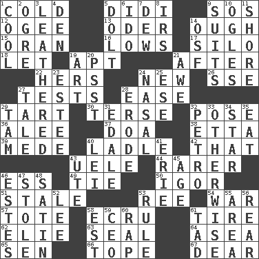 ACROSS 1. Having a low temperature 5. "You Light Up My Life" star Conn 9. Mayday 12. Double curve, resembling the letter S 13. River in Europe 14. Ending for "Through" and "Enough" 15. Northwest Algerian city 16. Moos 17. Grain storage tower 18. Allow 19. Fitting 21. Following 22. Possessive pronoun 24. ___ Haven, CT 26. Compass dir. 27. Trials 28. Relaxation 29. Small pie 30. Laconic 32. Introduce or present, as a question 36. Toward shelter 37. ___ good deed 38. Singer James 39. Ancient Persian 40. Dipping utensil 42. Not this but _ 43. Ubangi River tributary 44. More uncommon 46. Double-curved letter 49. Neckwear 50. Composer Stravinsky 51. Having lost freshness 53. To separate or throw off 54. Armed conflict 57. Carryall 58. Shade of tan 61. Hoop that covers a wheel 62. Writer Wiesel 63. Lick closed 64. At sea 65. Elected rep. 66. Drink excessively 67. Letter starter DOWN 1. Calm and collected 2. Legendary monster 3. Resembling or made to resemble leather 4. Lair 5. Dunce 6. Wedding promise 7. Morning condensation 8. Big collection agency 9. Sets of matching outer garments 10. Stares at amorously 11. Dinah or Pauly 14. Order of Saint Francis (abbr.) 19. Nonscientific branch of learning 20. Inconspicuous attention getter 21. Deep reverence 23. First name in cosmetics 24. Relating to the nose 25. Compass dir. 27. Falsehood 28. Eat (away) 29. Scottish cap 31. Peak District village in England 32. Stone: prefix 33. Else 34. Play the lead 35. Ingest 40. Luau accessory 41. 4th largest of the Great Lakes 43. Shoshoni 45. Mature 46. _____ Park, CO 47. Took without asking 48. Smooth fabric 52. Area sheltered from the wind 53. Governing power 55. Length times width 56. Rump 58. Eastern Standard Time (abbr.) 59. Corporate head (abbr.) 60. Strike 61. Small boy