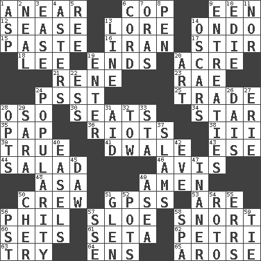 ACROSS 1. Approach 6. Police officer (slang) 9. Car or cant ending 12. Gospel singer Marvin 13. Old wives' tales, e.g. 14. Southwest Nigerian state 15. Thick mixture 16. SW Asia republic 17. Agitate 18. Area sheltered from the wind 19. Conclusions 20. Measure of real estate 21. French philosopher Descartes 23. Actress Charlotte 24. Inconspicuous attention getter 25. Exchange 28. Bear (Spanish) 30. Theater features 34. Play the lead 35. Infant food 36. Disturbances 38. One more than two 39. Loyal 41. A sleeping potion; an opiate (poet.) 43. Compass dir. 44. First course 46. Advice 48. White ___ sheet 49. So be it 50. Ship's personnel 51. Global Positioning Systems (abbr.) 53. "We ___ not amused" (Victoria) 56. Silvers or Donahue 57. _ gin 58. Derisive sound 60. Arranges properly for use 61. Bristle 62. _ dish (used to culture cells) 63. Attempt to accomplish something 64. Followers of ems 65. Came up DOWN 1. Cleo's killer 2. Anneal 3. Relaxation 4. Michaelmas daisies 5. Portuguese money of account (variant) 6. Drawstring 7. Mouths or openings 8. Animal enclosure 9. Pleas 10. Singer Brickell 11. Or not 13. Actor's bit 14. Motion picture awards 19. Keyboard key 20. Nonscientific branch of learning 22. Double-curved letter 24. Teen's desire 26. Raised platform 27. 4th largest of the Great Lakes 28. Chooses 29. "Two Mules for Sister ____" 31. Assist 32. Pull behind 33. R.R. building 37. Criticizes harshly 40. Artist's stands 42. Night before a holiday 45. Fool 47. More empty; more void 49. At sea 50. "Mermaids" star 51. Small, secluded valley 52. Plant holders 54. Printing process, for short 55. Blunders 56. Pacific Standard Time (abbr.) 57. Compass dir. 58. Health resort 59. Neckwear