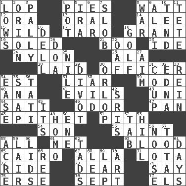 ACROSS 1. Chop off 4. Sliced desserts 8. Electrical Unit 12. Mouth or opening 13. Taken by mouth 14. Toward shelter 15. Uncontrolled 17. Edible starchy tuberous root 18. Monetary aid 19. Having a sole or soles 21. Sometimes accompanies a hiss 23. Binary compound 24. High-strength synthetic material 26. According to 28. Put down 30. Person of authority 34. Eastern Standard Time (abbr.) 37. One who doesn't tell the truth 39. Method 40. Santa ___, CA 41. Vices 43. Corn or form start 44. Suttee (variant) 46. Aroma 47. Baking dish 48. Curse 51. Essential or central part 54. Boy, to dad 55. Virtuous person 58. 100% 61. Was introduced to 63. Vital fluid 65. Capital of Egypt 67. Silent film actress Nazimova 71. Globular water bottle used in Asia 72. Travel on an animal 73. Letter starter 74. Declare 75. Celtic language 76. Back-to-school mo. 77. Raised railways DOWN 1. Moos 2. Constellation of myth 3. Friendly 4. Cooking vessel 5. Retirement account (abbr.) 6. Hearing organ 7. Oscar Madison type 8. Armed conflict 9. Jai ____ 10. Watch over 11. False hair 16. Small valley 18. Eighteen holes 20. ___ good deed 22. Clumsy lout 25. The longest river in the world 27. Direct toward a target or goal 29. A piece of turf (Scot.) 30. Fourth or lowest deck 31. Overturn; upset 32. Pulitzer Prize-winning author Ferber 33. It's straight from the horse's mouth 34. Relaxation 35. Fastener 36. Jacques of French films 38. Assist 42. Indian titles of respect 45. ___ a Wonderful Life 49. Like (prefix) 50. Compass dir. 52. Keyboard key 53. Land elevation 56. Trap for birds or small mammals 57. "_____ Recall" 58. Measure of real estate 59. Den 60. Hats (slang) 62. Small boys 64. 24-hour periods 66. To riddle 68. Area sheltered from the wind 69. Pet locale 70. Tate display
