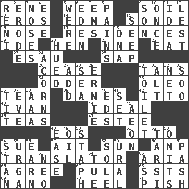ACROSS 1. French philosopher Descartes 5. Shed a tear 9. Land 13. Greek god of love 14. Pulitzer Prize-winning author Ferber 15. Something which is sent 16. Sense of smell 17. Homes 19. Binary compound 20. Layer 21. Compass dir. 22. Consume 23. Son of Isaac 25. Plant excrement 26. Desist 30. Scottish caps 34. More peculiar 35. Margarine 36. Lacerate 39. Natives or inhabitants of Denmark 42. "Tell ____ the Marines!" 43. "Terrible" tsar 44. Perfect 46. Beverages made from leaves 47. First name in cosmetics 48. Greek goddess of the dawn 51. "Beetle Bailey" pooch 54. Take to court 57. Small island 58. Player for Phoenix 60. Electrical Unit 62. Interpreter 65. Roberta Peters solo 66. Match 67. Monetary unit of Botswana 68. Fast planes 69. Billionth: prefix 70. The bottom of a shoe or boot 71. Expression of disdain DOWN 1. Painter Guido (1575-1642) 2. Eat (away) 3. Olfactory organs 4. Compass dir. 5. We are 6. Genesis locale 7. Followers of ems 8. Aches 9. Male offspring 10. At one time in the past 11. The content of cognition 12. For fear that 15. Ooze 18. Heredity factor (abbr.) 20. Took on color 24. Oak nuts 27. Say or write further 28. Ocean 29. Bert's buddy 30. Bathroom 31. The first octave above the treble staff 32. Was introduced to 33. "Barney Miller" actor Jack 36. Teat (slang) 37. First lady 38. American Automobile Association (abbr.) 40. Begley and Asner 41. Arrange properly for use 45. Age 48. Comfort 49. Petroleum 50. Staphylococcus 52. Tarsus (plural) 53. Leaves out 54. Comedian Laurel of Laurel & Hardy 55. Capital and largest city of Mongolia 56. Merit 58. Flatfish 59. Mountain range 61. Romantic infatuation 63. Modern: prefix 64. Third day of the wk. 65. Viper