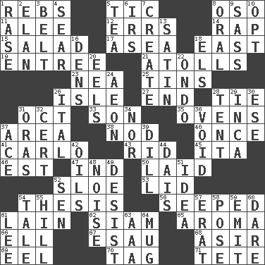 ACROSS 1. Confederate soldiers (slang) 5. Nervous spasm 8. Bear (Spanish) 11. Toward shelter 12. Blunders 14. Hit sharply and swiftly 15. First course 17. Toward the sea 18. 90 degrees 19. Main course 21. Ringlike coral islands and reefs 23. Teachers' org. 25. Airtight sealed metal containers 26. Capri or Wright 27. Conclusion 28. Neckwear 31. Sep. follower 33. Male offspring 35. Baking chambers 37. Length times width 38. Allow head to fall sleepily 40. At one time in the past 41. Monte _, Las Vegas Hotel/Casino 43. To free from 45. Call ___ day 46. Eastern Standard Time (abbr.) 47. Indiana (abbr.) 50. Put down 52. A type of plum 53. Flaplike covering 54. College paper 56. Oozed 61. (Had) reclined 62. Thailand, formerly 65. Odor 66. Pipe bend 67. He sold his birthright 68. SW Saudi Arabia district 69. Snakelike fish 70. Label 71. Wig DOWN 1. Raze (variant) 2. Enthusiasm 3. Waist strap 4. Dry up 5. Afternoon social gathering 6. Big collection agency 7. Make 8. Of the mouth 9. Backtalk 10. Choose 13. Smooth fabric 16. Habitations of wild animals 18. Raised railways 20. Snakelike fish 22. Southwest Nigerian state 24. A really long time 26. Slanted text style (abbr.) 28. Portable shelter 29. South American Indian 30. Compass dir. 31. Mouths or openings 32. Foregone conclusion 34. And not 36. Lacking any legal or binding force 37. Adept person 39. Deli pickle 42. Lubricates 44. Raised platform 48. Annoying sound 49. Cease 51. The content of cognition 52. Elected rep. 54. Lie 55. Land elevation 57. Part of Q.E.F. 58. Airs 59. Send forth 60. Have the gumption 61. Area sheltered from the wind 63. Auto club (abbr.) 64. Large cup
