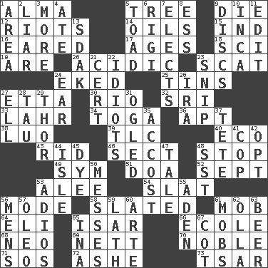 ACROSS 1. _ mater 5. Family _ (genealogy) 9. Pass on 12. Disturbances 14. Petroleums 15. Working for oneself (abbr.) 16. Having ears or earlike features 17. Ripens 18. _-fi 19. "We ___ not amused" (Victoria) 20. Being or containing an acid 23. Get outta here! 24. Made supply last 25. Metal containers 27. Singer James 30. River (Sp.) 32. _ Lanka 33. Cowardly lion portrayer 34. Ancient Roman robe 36. Fitting 38. Nilotic language 39. Affectionate concern, for short 40. Environmental prefix 43. To free from 46. Religious group 48. Obstruct or block passage 49. Symbol (abbr.) 51. ___ good deed 52. Back-to-school mo. 53. Toward shelter 54. Narrow board 56. Method 58. Scheduled 61. Disorderly crowd 64. Biblical high priest 65. Austrian river, tributary to the Danube 66. Learning spot: Fr. 68. Modern: prefix 69. Remaining after all deductions 70. Having high moral qualities 71. Distress signal 72. American tennis player Robert 73. Russian ruler of old DOWN 1. Type of rug 2. One who doesn't tell the truth 3. Greater amount 4. Had dinner 5. Frog relative 6. Swiss mountan, "Queen of the Mountains" 7. Opts 8. Curvy letter 9. Flat circles 10. South American Indian 11. Prepare for publication 13. Neighbor of Neb. 21. Certainty 22. Foolish or stupid persons 23. Sever or remove by pinching or nipping 24. Ewer handle 26. Retirement account (abbr.) 27. Pipe bend 28. The 19th letter of the Greek alphabet 29. Son of Odin 31. Stared 35. Buttonhole 37. False hair 41. Police officer (slang) 42. Elect 44. Small island 45. Color 47. Story 48. Fast jet (abbr.) 50. Makes clutter 53. Goodbye (Sp.) 55. An important port of Yemen 56. Not women's 57. Butter sub 59. Thin strip of wood or metal 60. Johnson of "Laugh-In" 61. Crowds into 62. Spanish pot 63. Fermented drink made from hops 65. _ tizzy (2 wds.) 67. Small bed